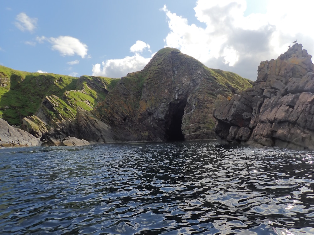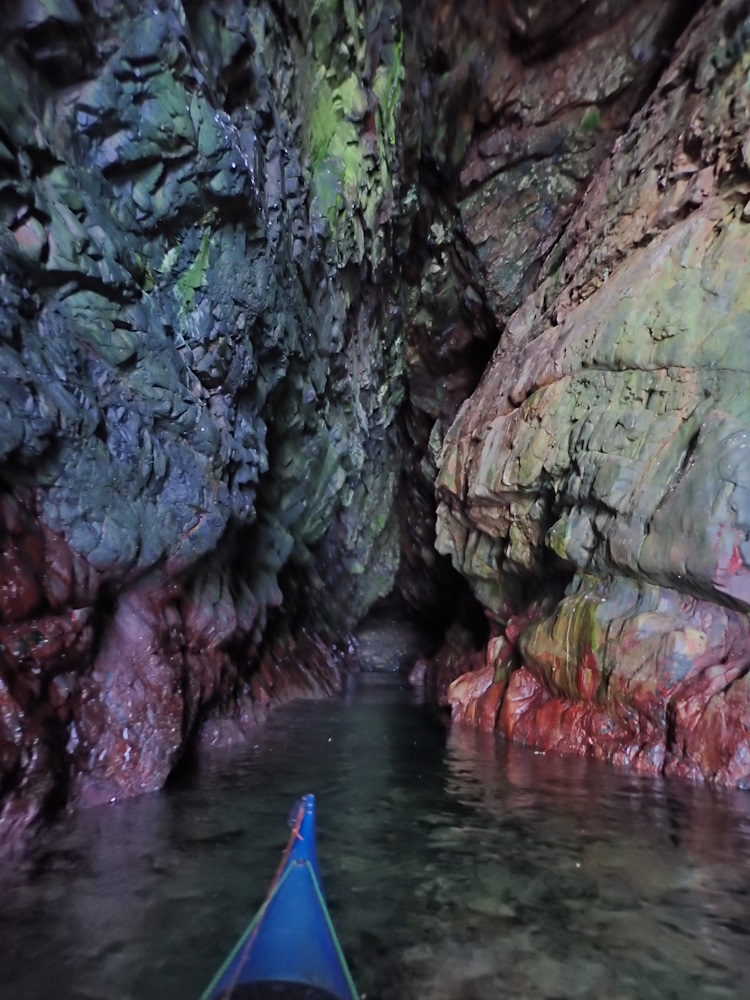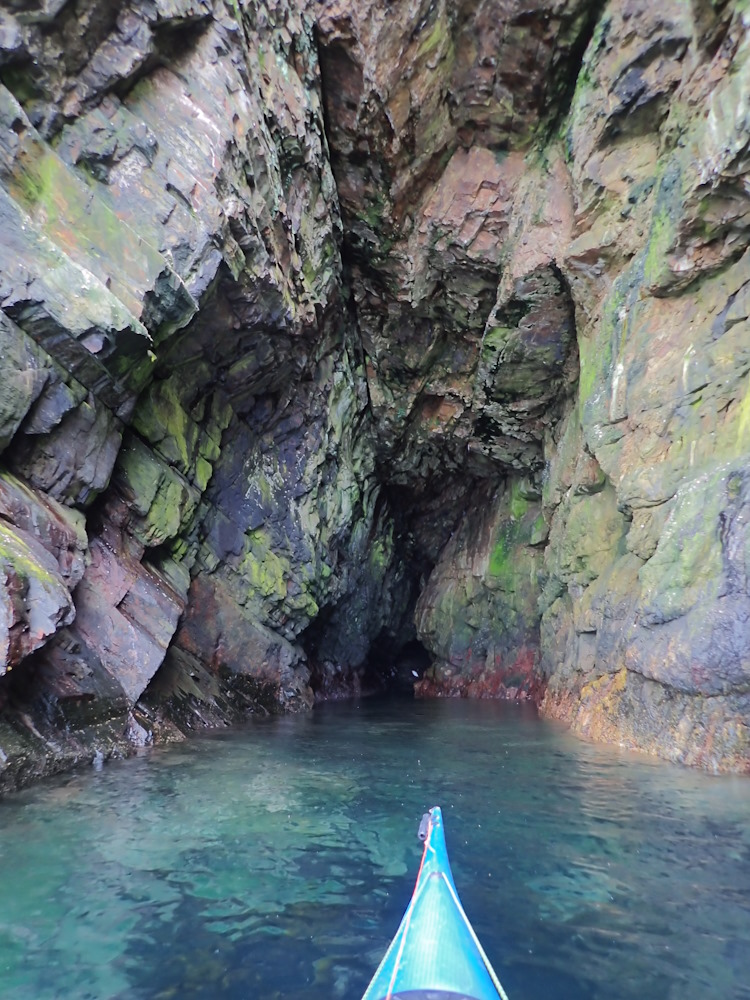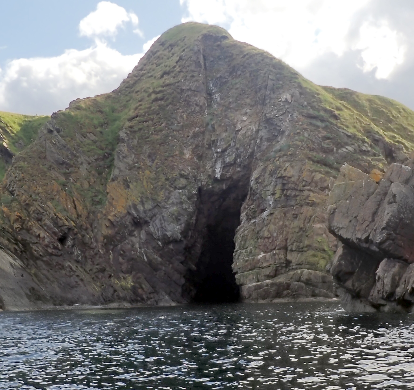 A fine intertidal cave with near vertical rifts which converge downwards above the ceiling, forming a wedge. Faces NNW. Entrance width is 5.5 m near HW level.