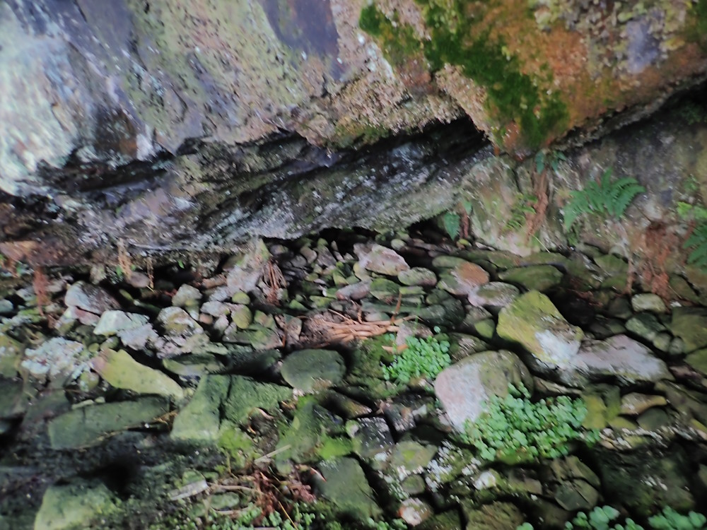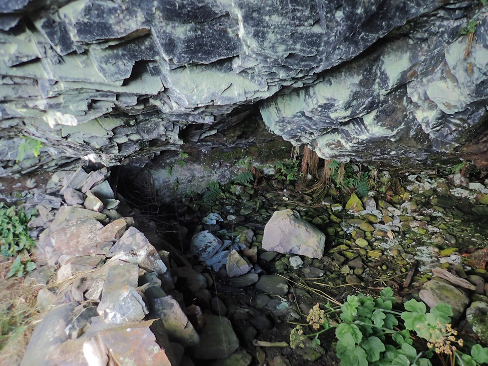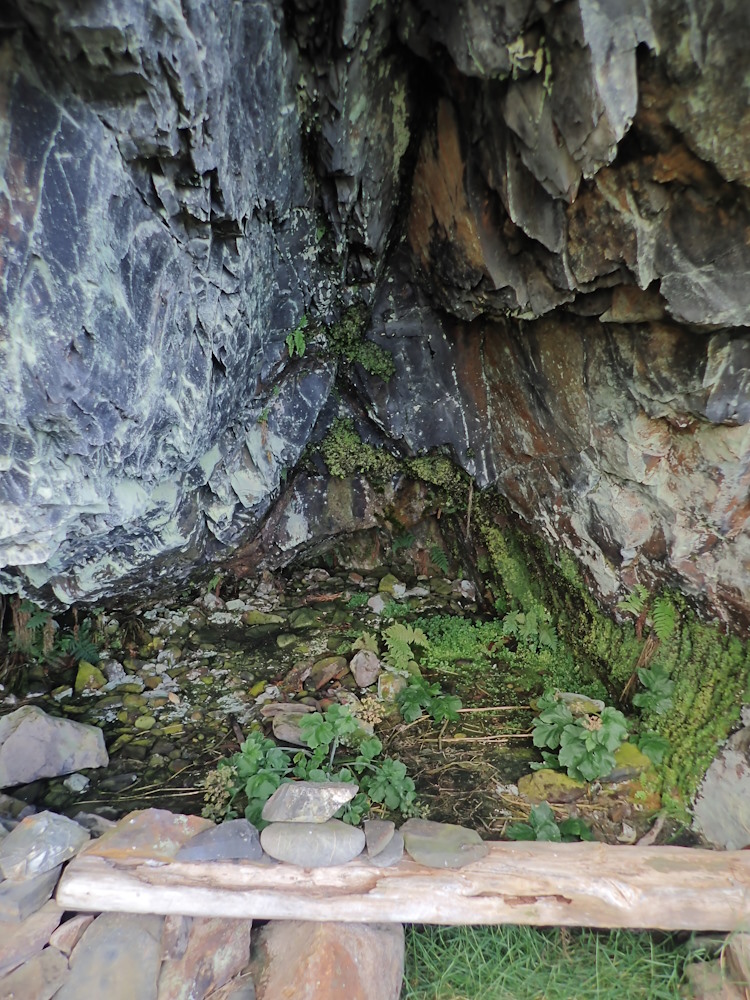 A small and rather damp cave with a rough floor and a low wall across, just inside the entrance. It is credible as a past habitation of travellers.