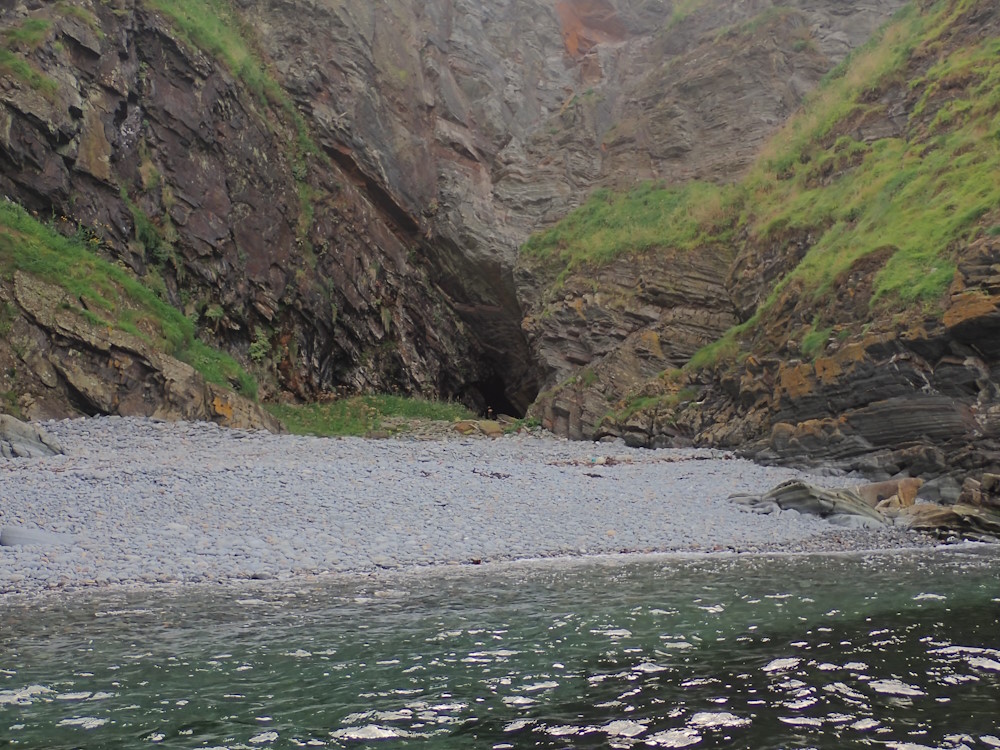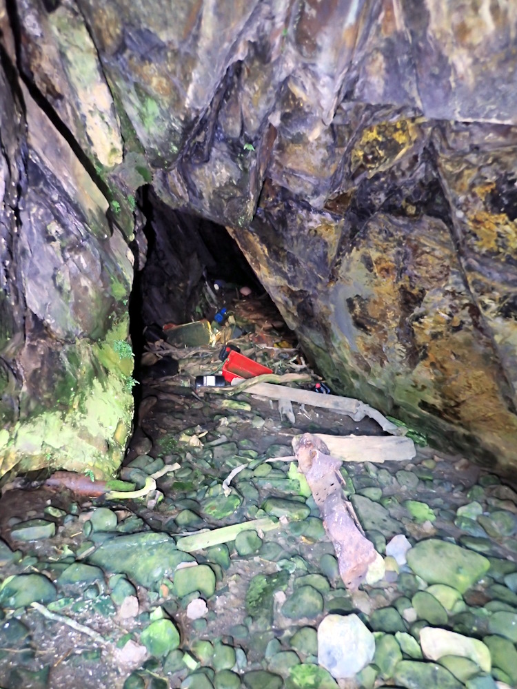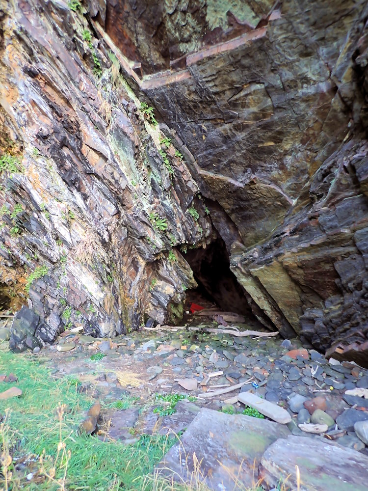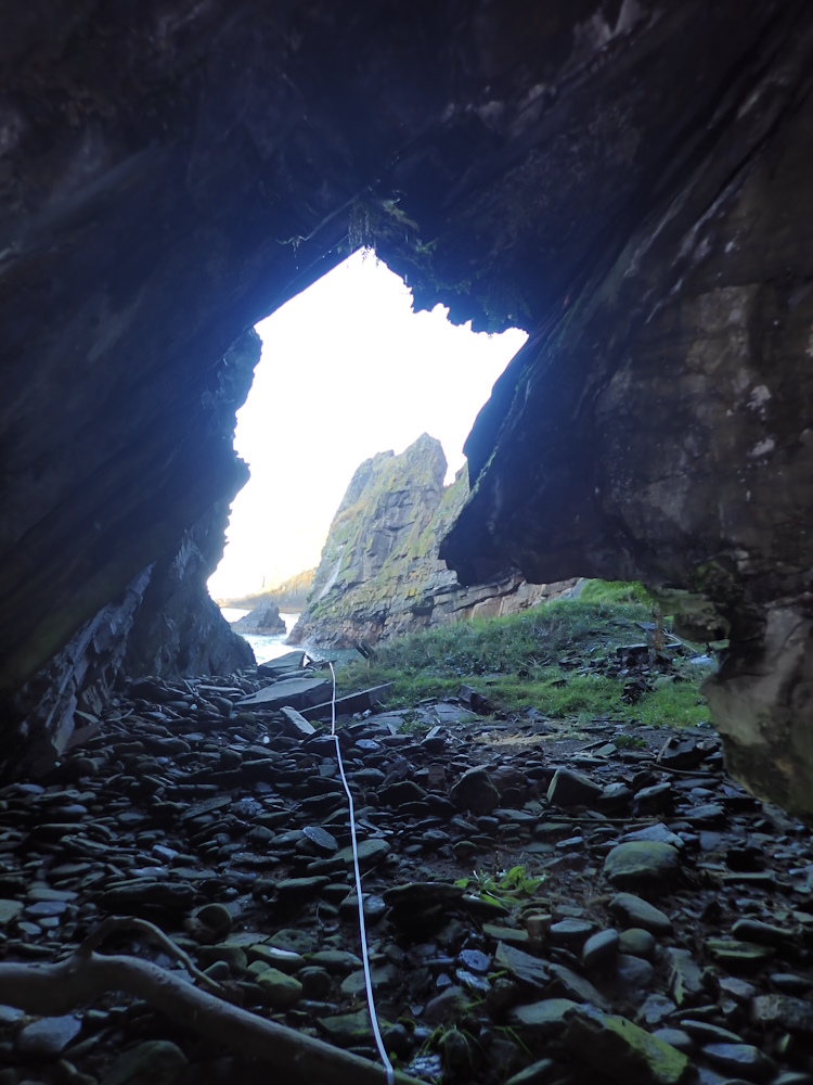A supratidal cave in the W corner of the beach, facing NE by E (056), under about 3 m of overhand. Width at 3m in is 6.5 m, and floor to ceiling there is 4.3 m.