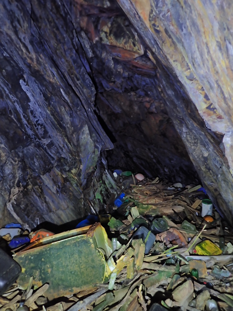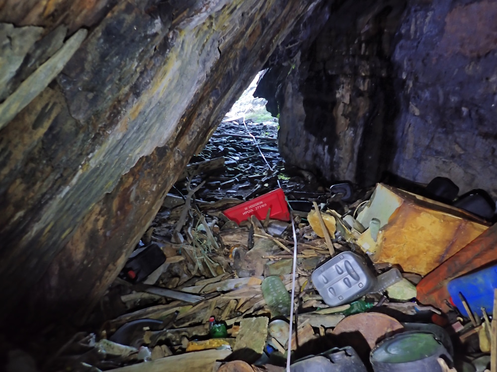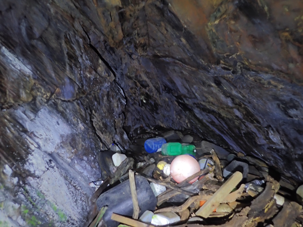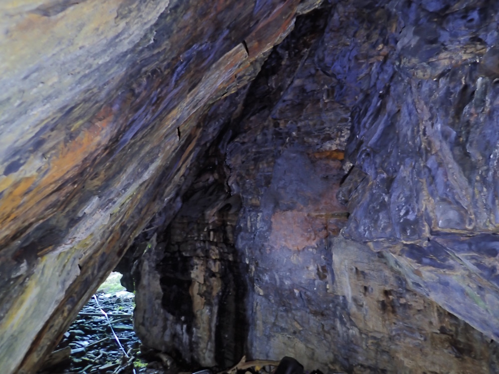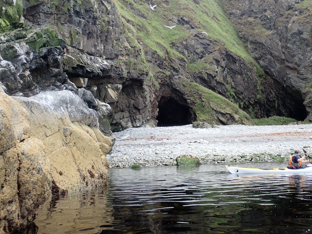A supratidal cave in the W corner of the beach, facing NE by E (056), under about 3 m of overhand. Width at 3m in is 6.5 m, and floor to ceiling there is 4.3 m.