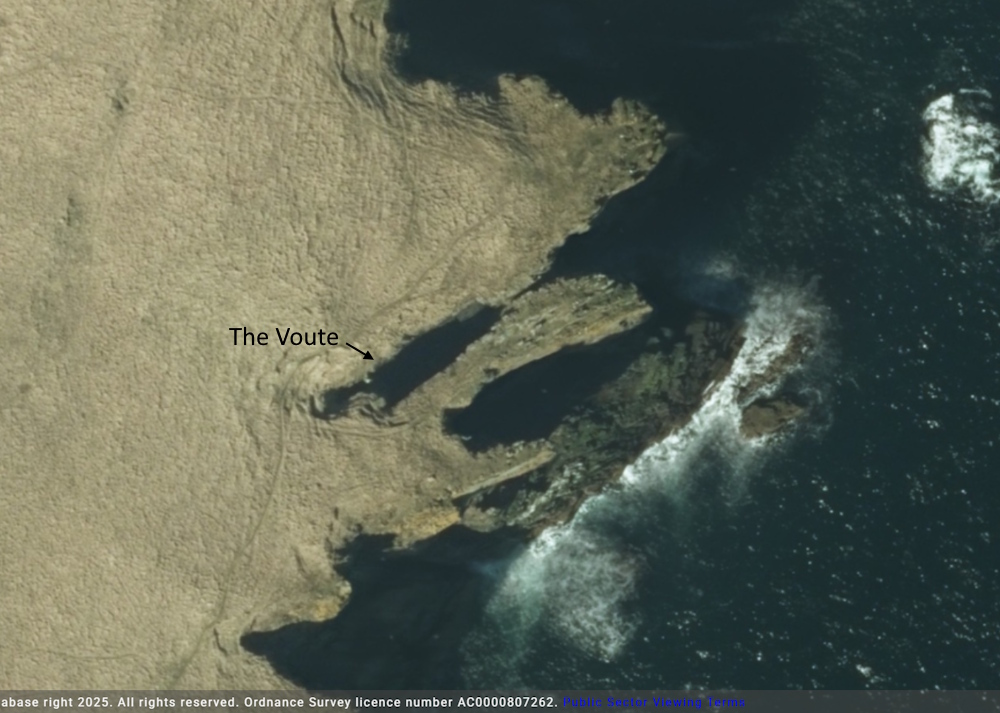 Notes: The positioning of the placename on the OS maps suggests the name applies to the headland not the gloup. The description above makes it clear the reference is to the gloup (or specifically the natural arch) with an upper and lower passage (probably with different alignments) with the upper passage dry at low tide and the lower passage remaining at least partially flooded. One seems to be in line with the gloup at the NE end. 'cave' on some OS map layers suggests the other passage/tunnel may come in from the east, nearer the S end of the gloup.