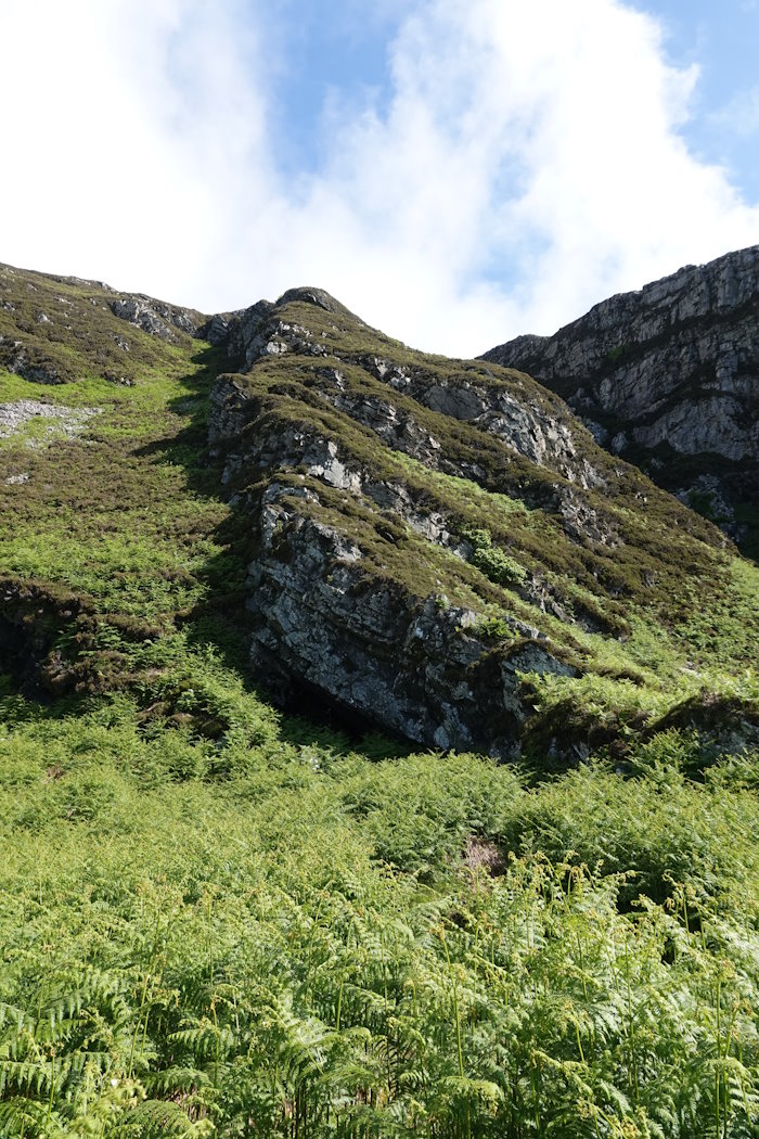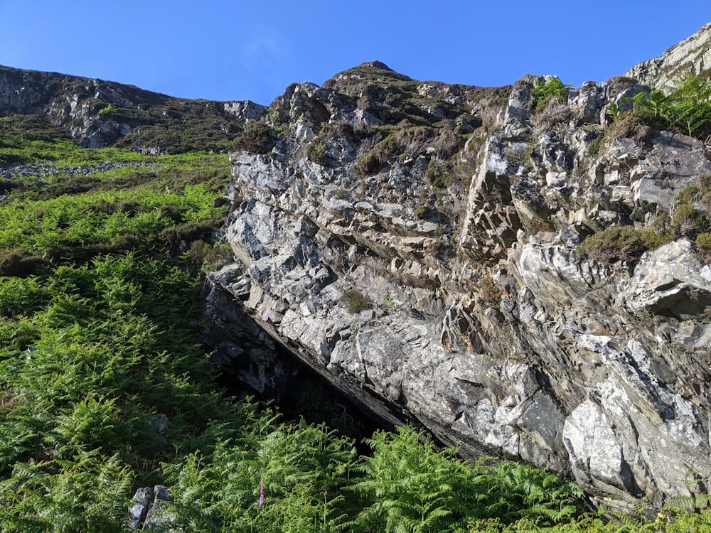 Raised beach sea-cave at the end of a rocky ridge. Faces south south west.