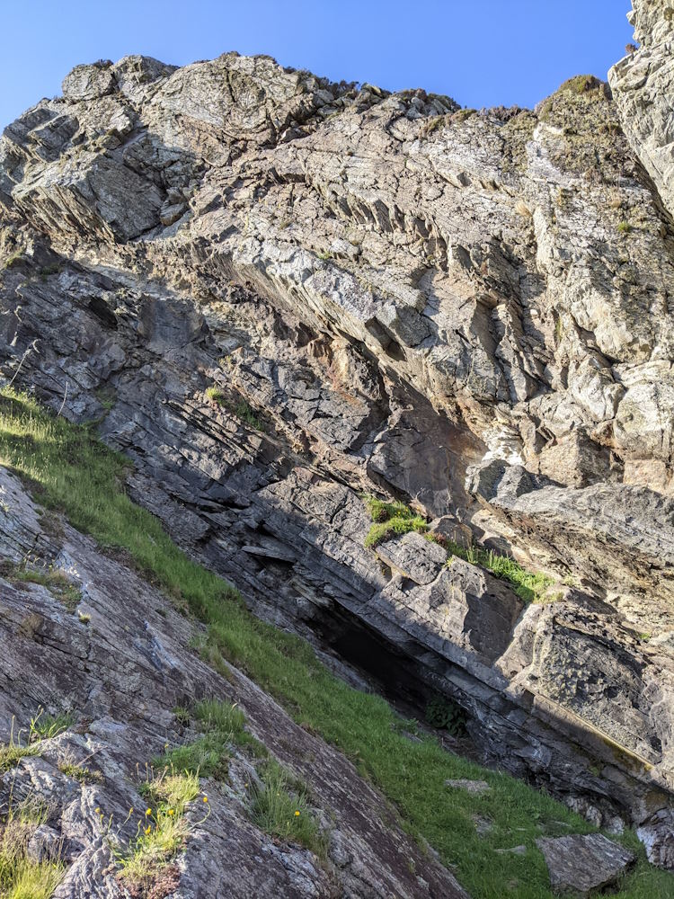 A raised beach missing layer cave. The slit is at about 36 degrees to horizontal, rising to the west. It faces about SSW.