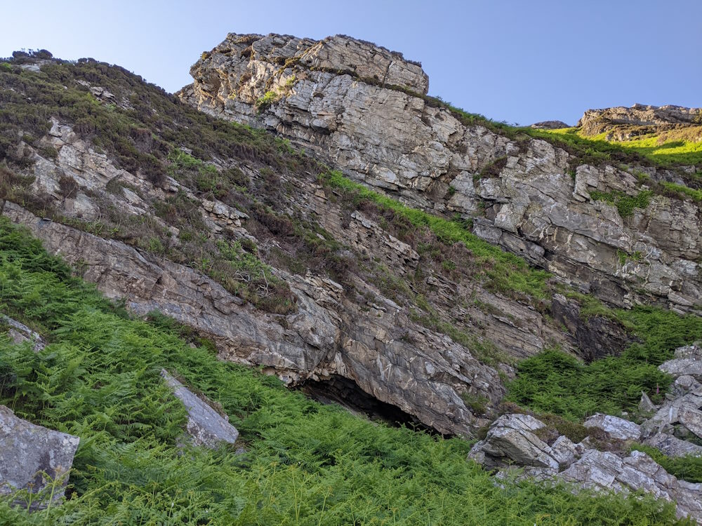 A raised beach missing layer cave. The slit is at about 28 degrees to horizontal, rising to the west. It faces about SSW.