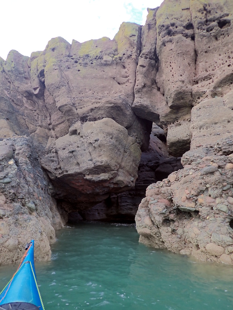 A chubby subtidal cave which widens on the NNE side and has a straight up gloup on that side. The entrance looks a bit like a lopsided 'Y', particularly nearer low tide.