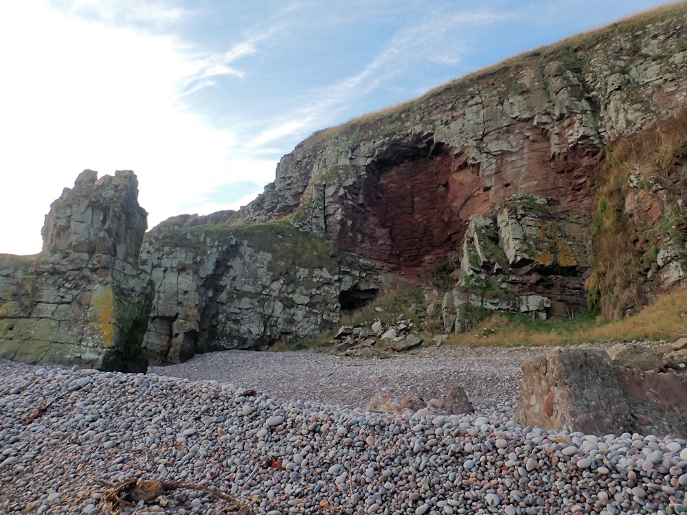 Notes: Access: by land - walking across fields and then down the cliff from near NO 85095 73925 and SW along the beach.