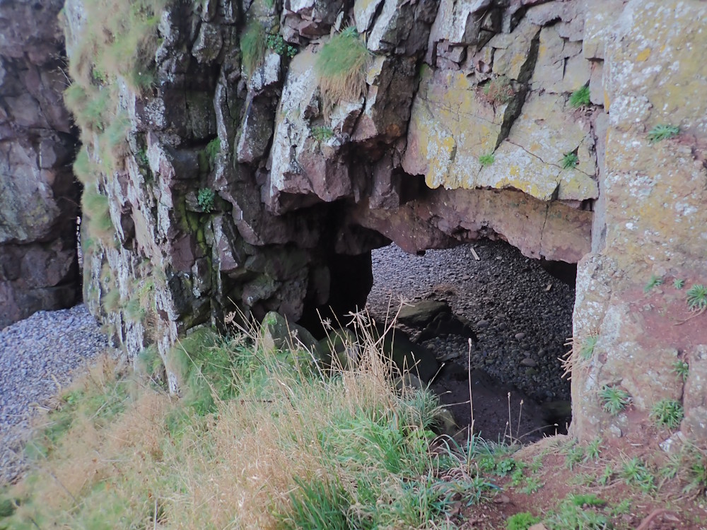 A supratidal rift cave on the Ox Layers, a little W of the Pintill Stone (a stack) . Faces SSE. It has an E entrance up a talus slope inside and outside - which is the nearest correspondence with an OS cave dot. There is an extension NNW to a small rectangular chamber which is mostly blocked by two rectangular blocks. There is a narrow gap on either side of the top block and a space ca 1.2 m above it.