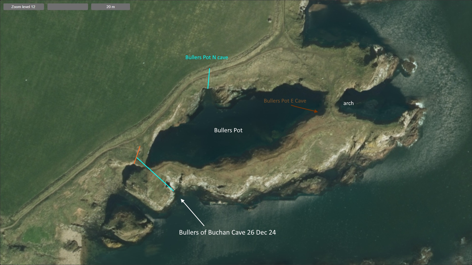 Bullers of Buchan Cave (E entrance) North Cave of Bullers Pot East Cave of Bullers Pot Arch of Bullers of Buchan Pot Bow of Pitwartlachie Bowlindoirs Blockie Head subterraneous passage (S entrance) Blockie Head subterraneous passage (N entrance) Robie's Haven Cave Rumbling Hole North Seals Cave South Seals Cave