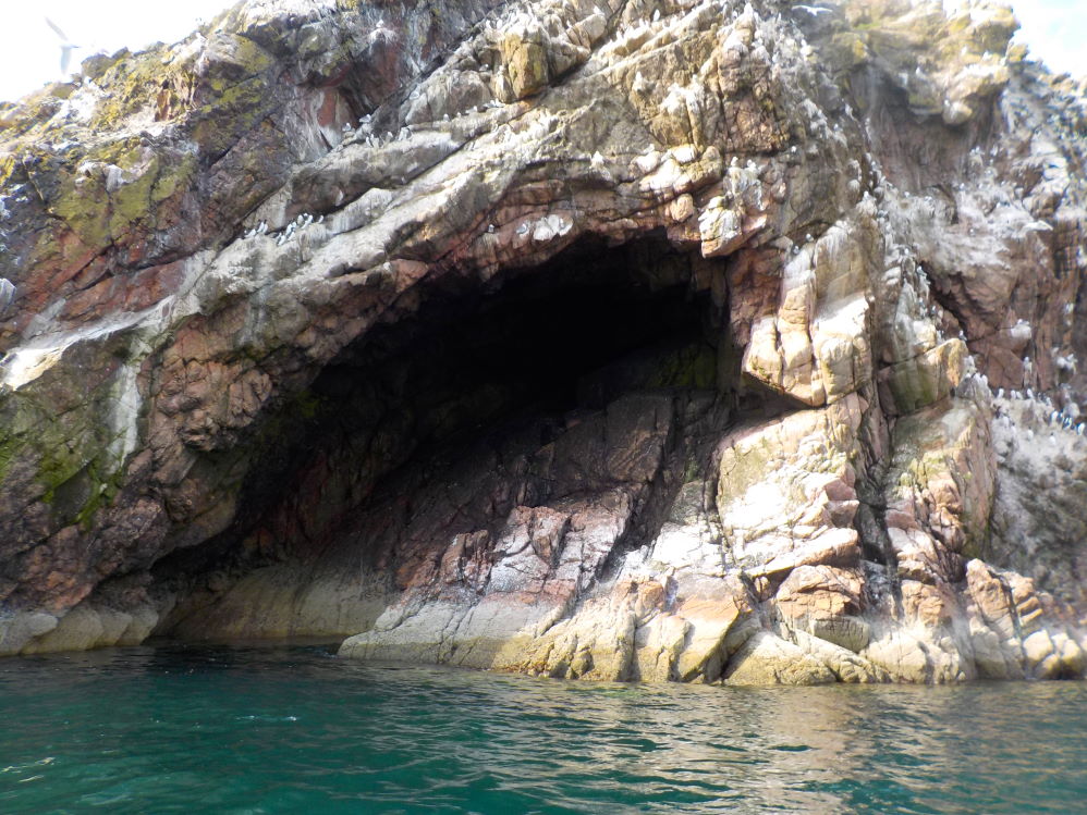 More of a medium sized alcove than a cave. Not much length of water in it. Has an upper part going up to the right (NE) used by doos (rock pigeons) and probably shags & guillemots.