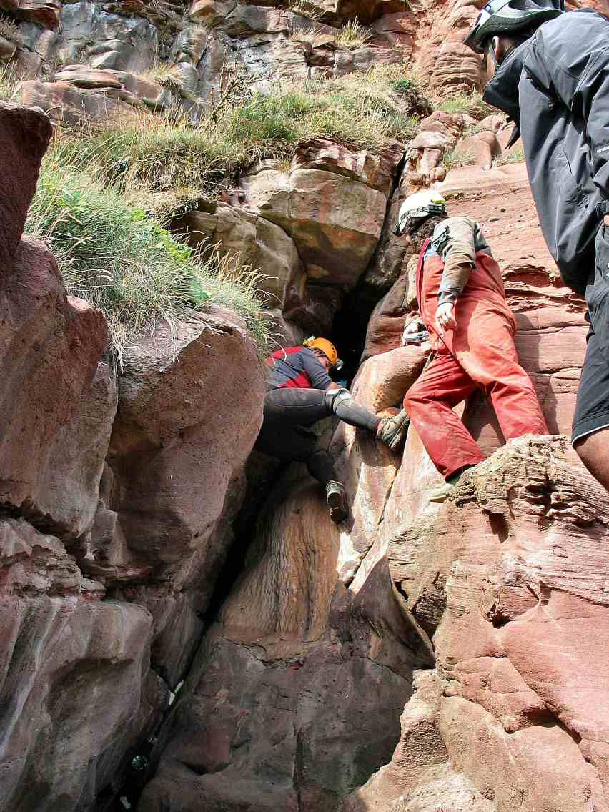 From UK Caving Forum: "There were a couple of nasty old nylon half inch ropes that were best avoided at the drop to the lower level but one of them came undone recently. There was also the remains of a ladder but its only got one rung left. There is an old log ladder hiding behind it. If its dry its easy enough to bridge your way up and down but if its wet it can be very slippery. If in doubt I chuck a couple of climbing nuts in the cracks on the floor (3 and a 5 I think) and attach a short length of rope. There are a couple of carved arched footsteps and helpful rectangular shaped handhold at the entrance.