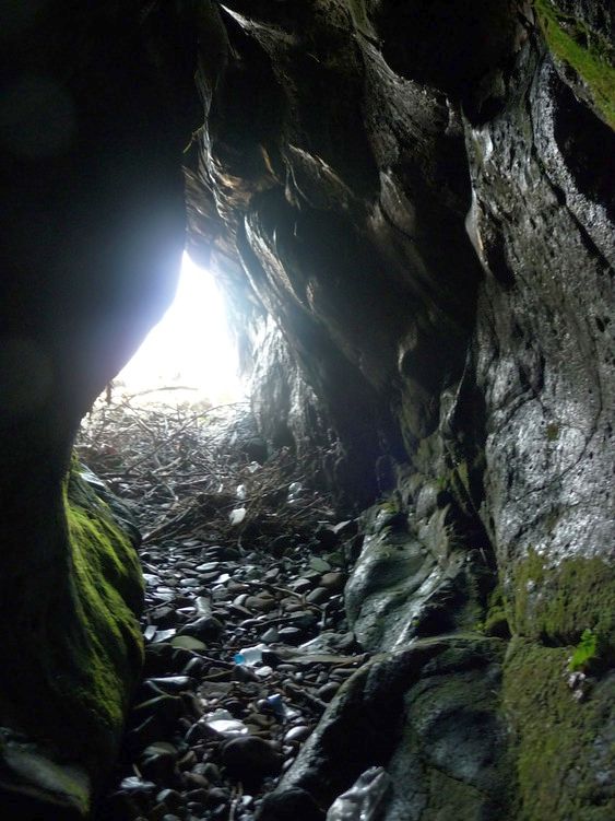 Small cleft in cliff to north (NS 23411 10366) behind heavy vegetation investigated 2019. No enterable passage.