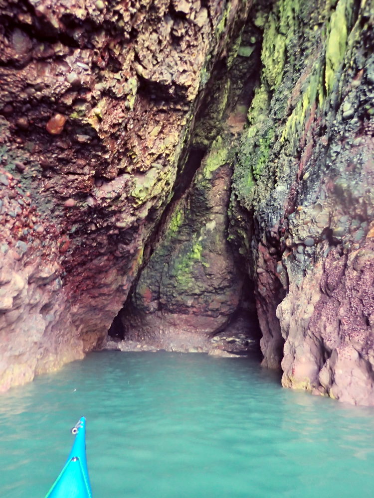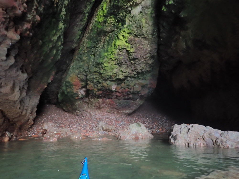 One through passage is available in the top 3/4 of the tide and low to moderate swell between the middle and S entrances. A second, much longer one of approx 179 m is available in the top 1/4 of the tide and low swell between the N and S entrances provided there is no shingle bank blocking the SW half of the N passage. It was observed unblocked on 18 Feb 23. See above for more info.
