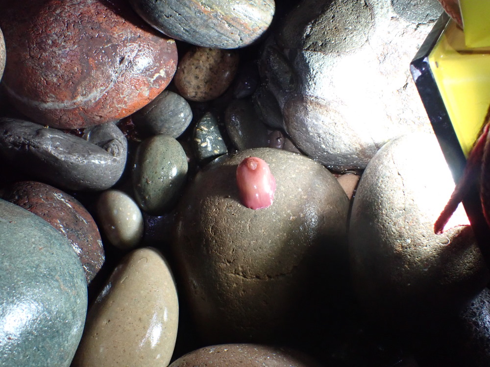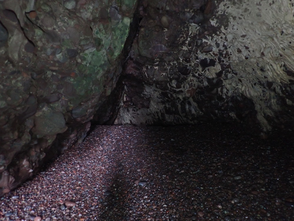 There is a south-facing pebble beach ending about 20m northwest from where the north and south tunnels join. On 29 August 24, the pebble beach was almost completely scoured of pebbles, leaving mostly bedrock - see photo 13.