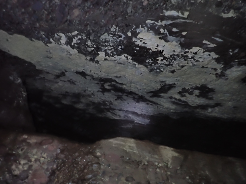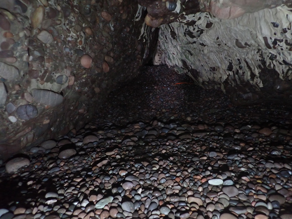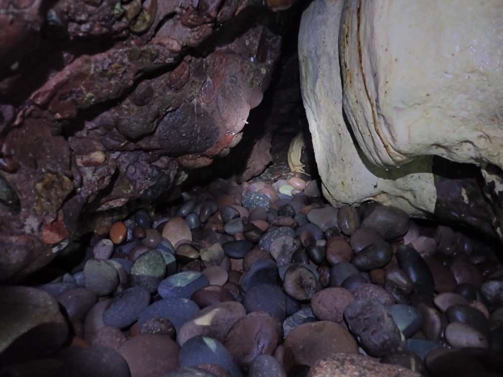 The two main tunnels run approx southwest from the north entrance, and northwest by west from the south entrance, meeting at approx NO 87822 81408. This route from the north entrance to the south was just navigable from July to September 2019 about 1h30 before a 3.8 m high tide. However, when this was attempted in July 2020, there was found to be a middle pebble beach blocking the south part of the north tunnel (Photo 4). This remained at least until the end of Aug 20. But by 8 Oct 20, it had almost entirely been washed away - presumably by 3m + northeast swell on the previous weekend. So this beach appears to be there, or not, depending on the most recent stormy weather. On 20 Mar 21, there was no middle beach.