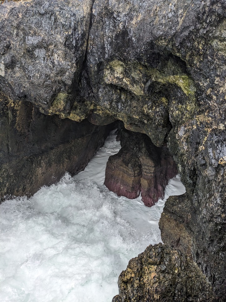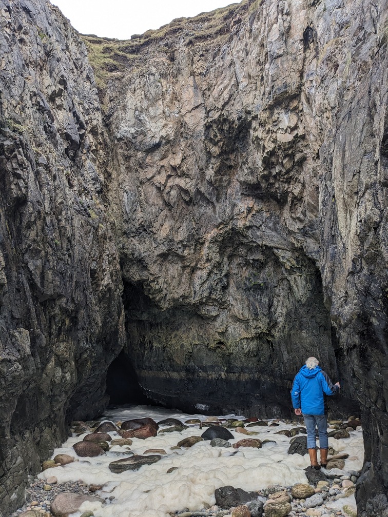 A lengthy and energetic sea tunnel with a lengthy pothole located midway along, essentially creating two separate permanently flooded tunnels (North Gyle & South Gyle). The sea entrance to the North Gyle tunnel is typically too turbulent for entry, whilst the South Gyle tunnel is frequently covered in sea foam.