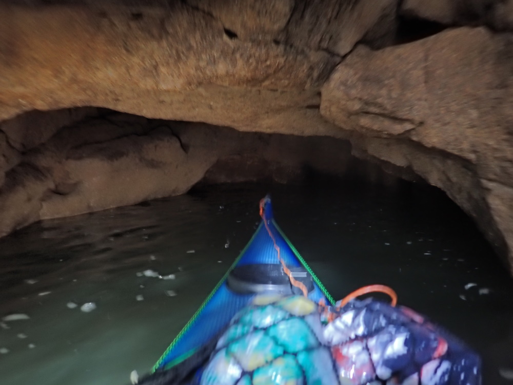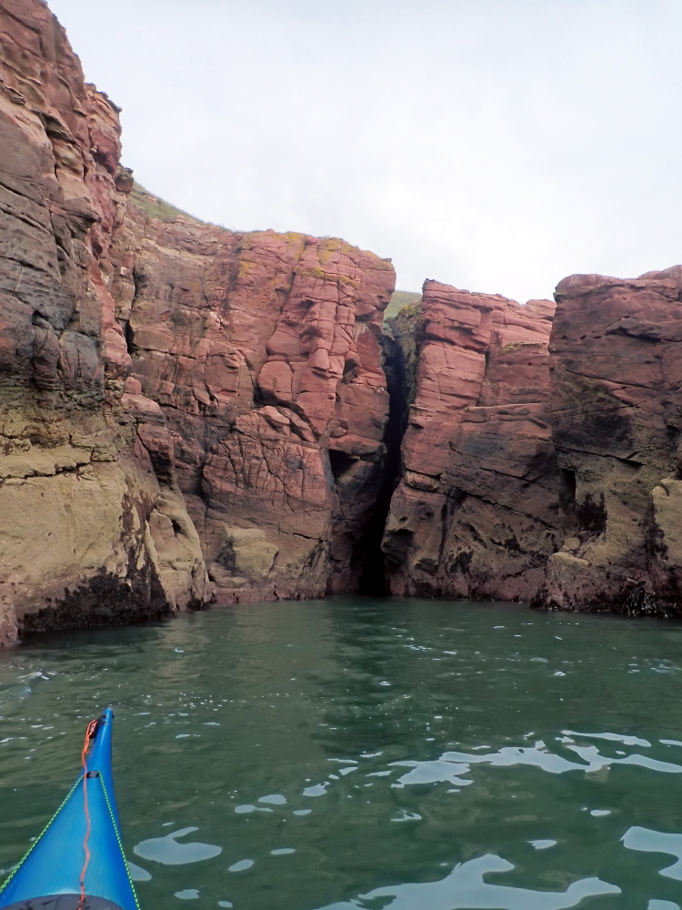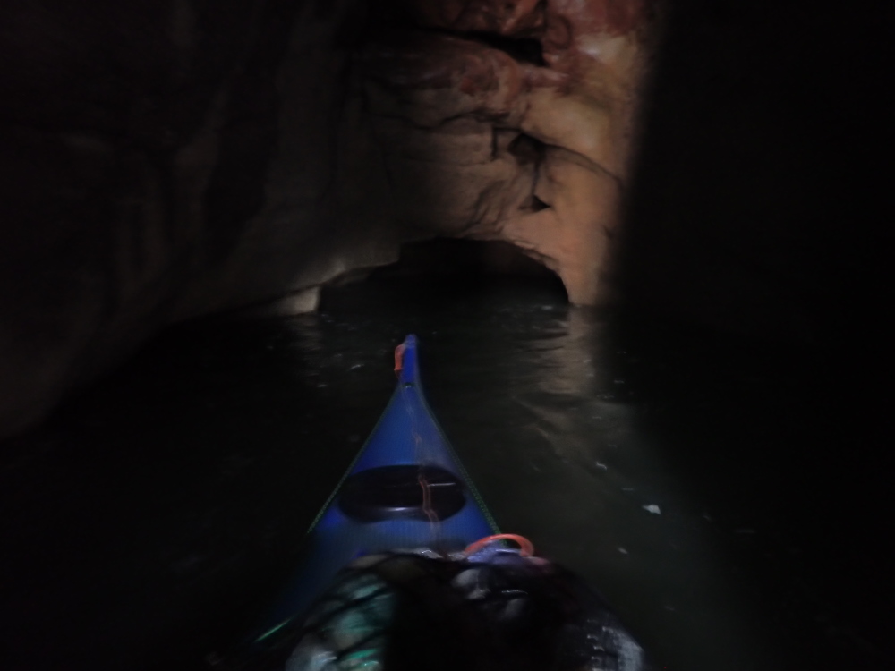 A fairly short subtidal cave at the end of a short, but tall geo. At its N end is a low chamber 5m long and probably about the same wide. This has a low entrance which is completely submerged by mid tide