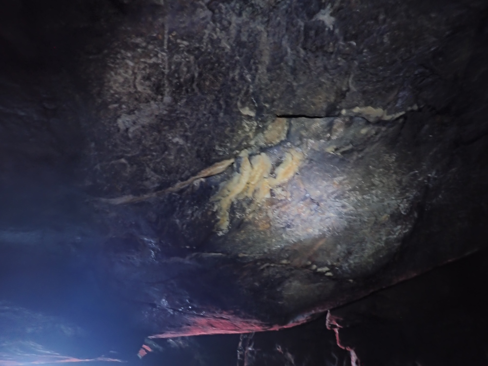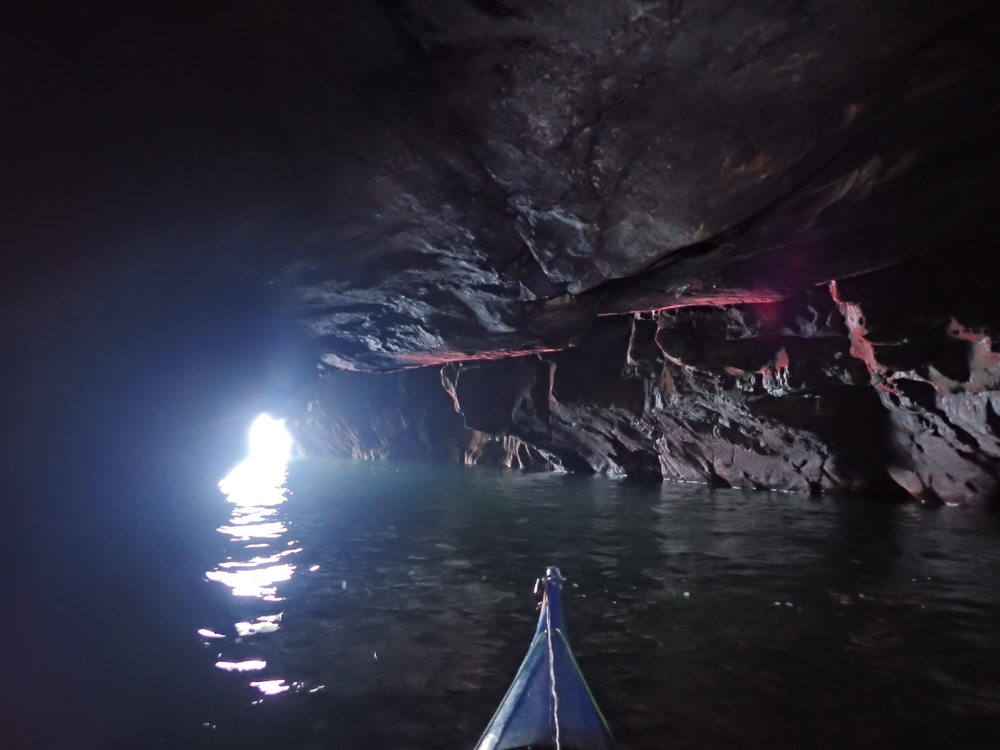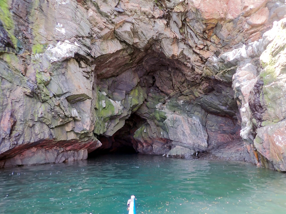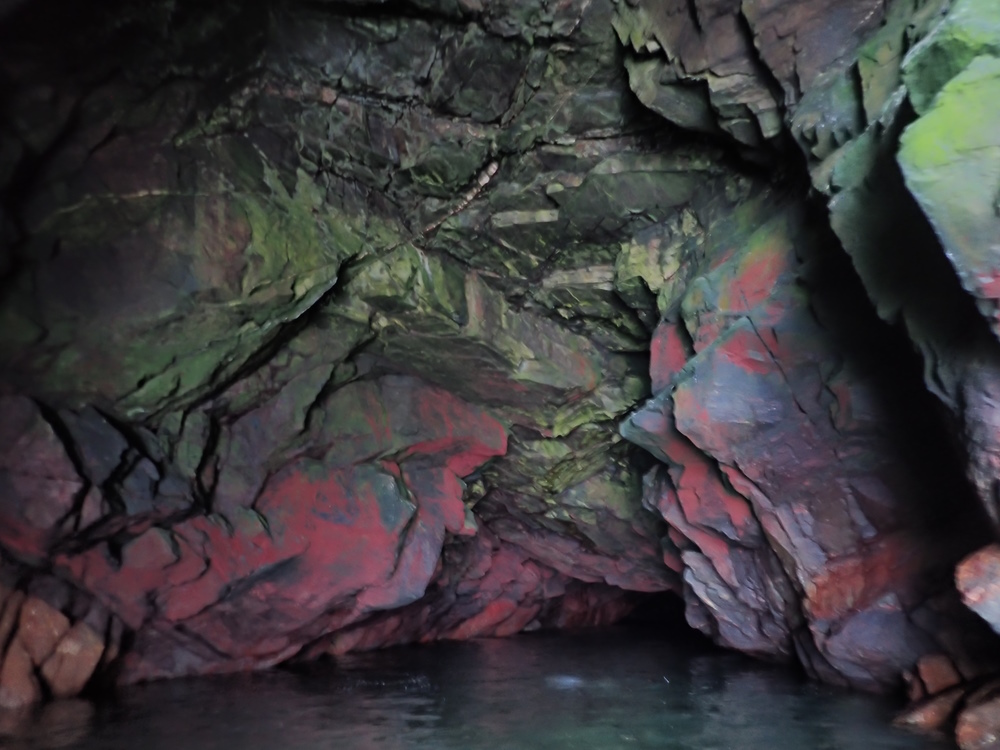 A fine seacave which curves round to right and then a bit left, which has big boulders at low tide. At HW the cave is flooded to the end. The entrance is 11.4 m wide. It has at least one small bit of flowstone on the ceiling - see photo 9.