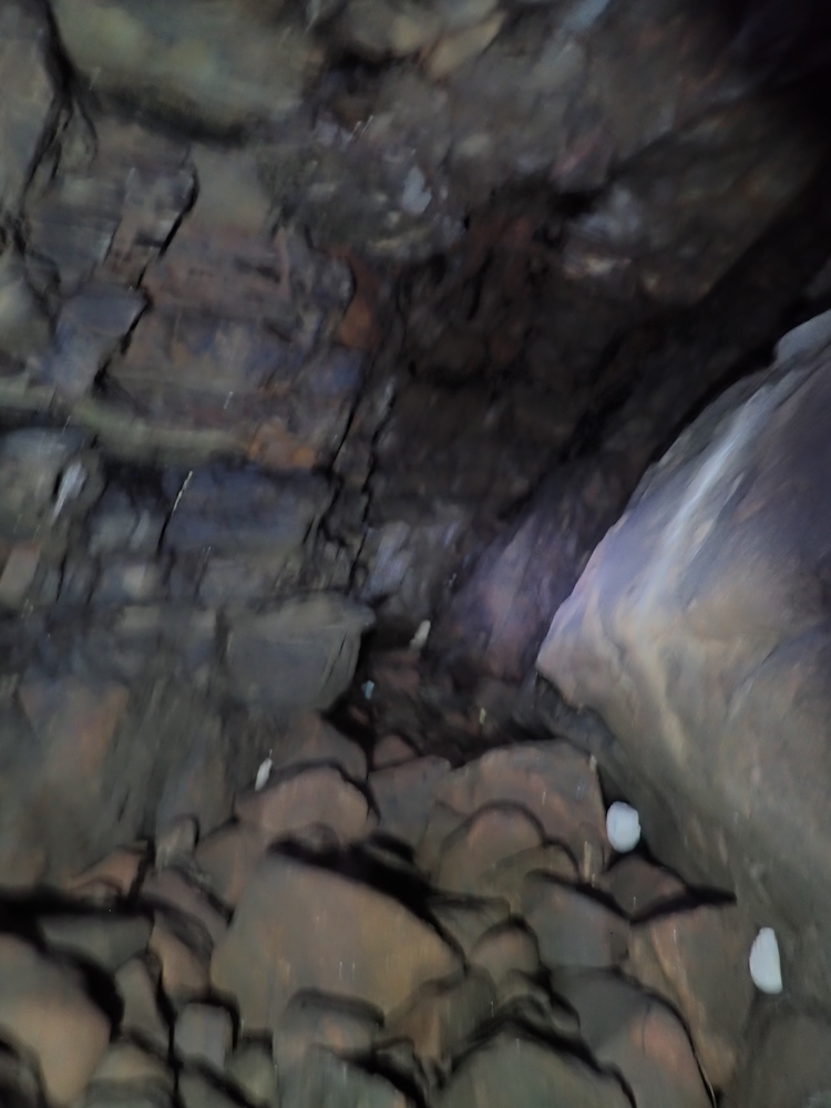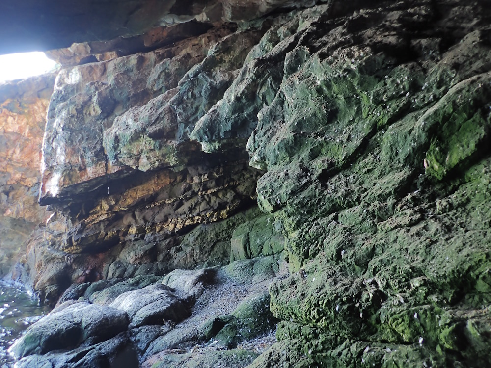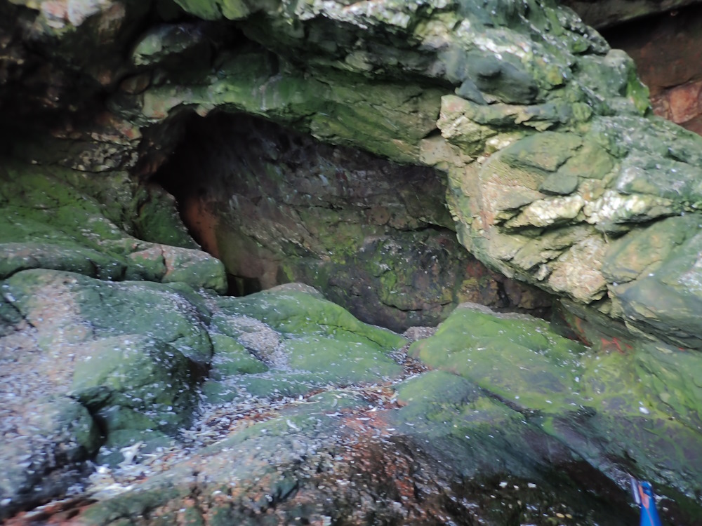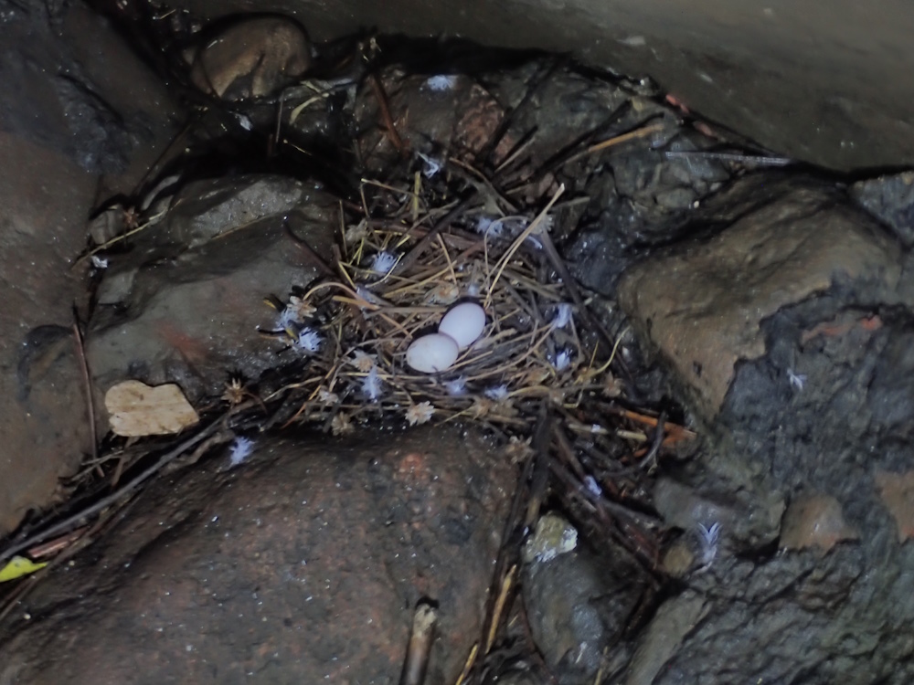 The cave is much used by rock pigeons. Three nests were seen on the floor of the E rift tunnel, one of which had two eggs in it. The pool appears to be anoxic at the bottom, but vigorous invertebrate activity was noticed on 31/8/23 in the shallow edges. It is probably fed by fresh water seepage and undoubtedly receives seawater spray during SE gales - so the water is likely brackish over a wide range of salinities.