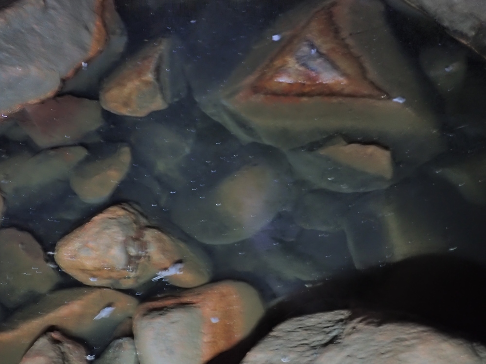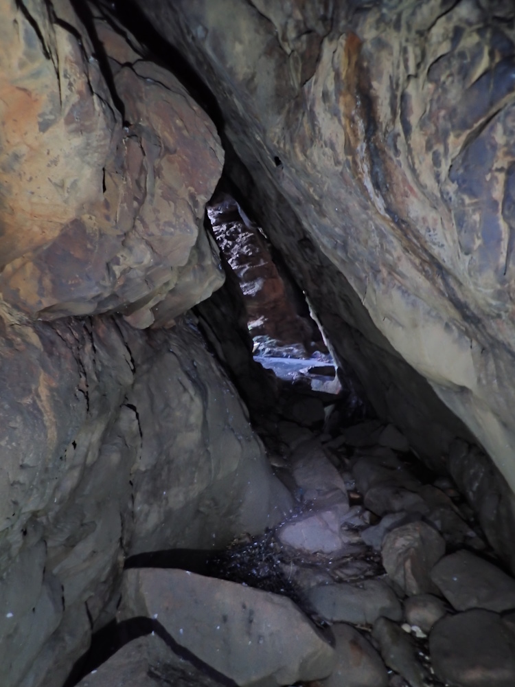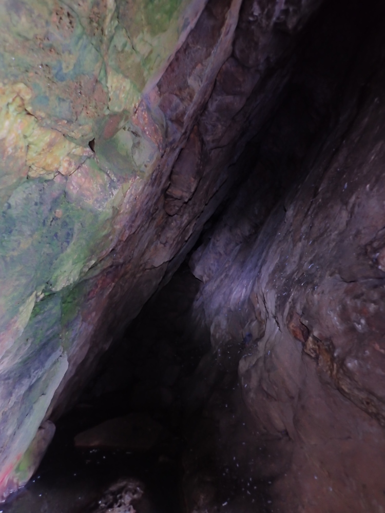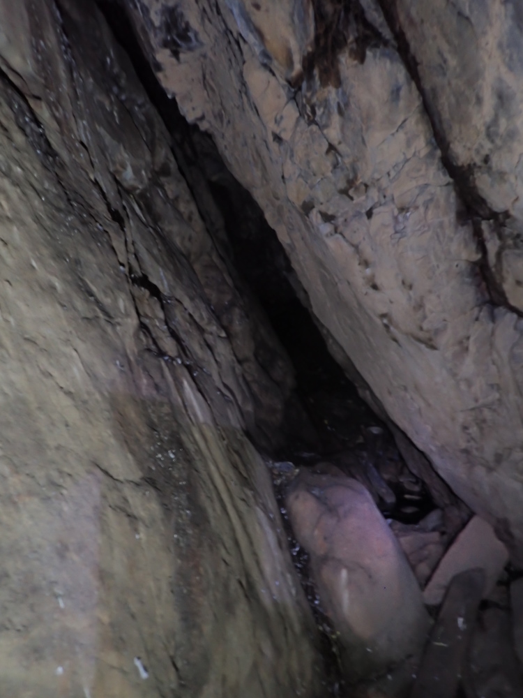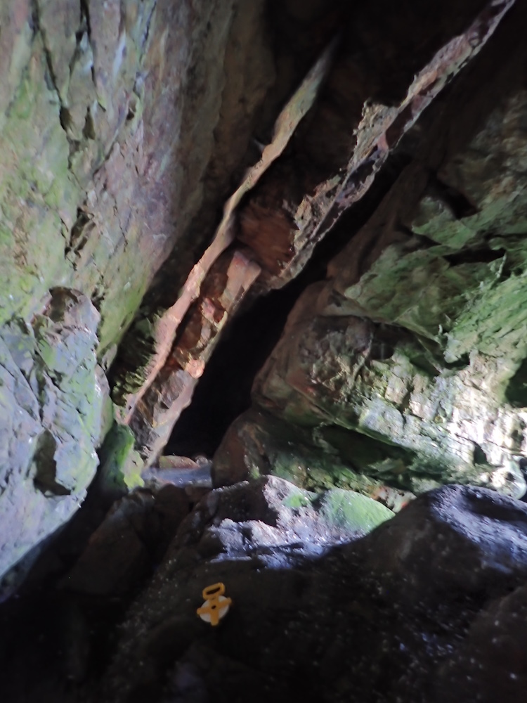 The cave is much used by rock pigeons. Three nests were seen on the floor of the E rift tunnel, one of which had two eggs in it. The pool appears to be anoxic at the bottom, but vigorous invertebrate activity was noticed on 31/8/23 in the shallow edges. It is probably fed by fresh water seepage and undoubtedly receives seawater spray during SE gales - so the water is likely brackish over a wide range of salinities.