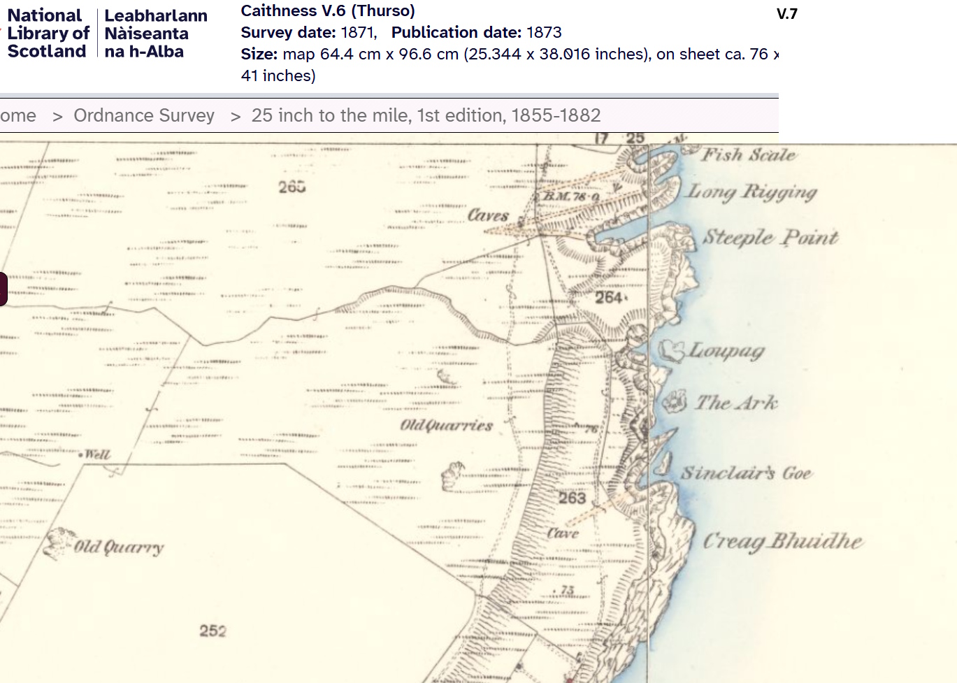 Sea Cave, from the rear of Sinclair Geo, facing NE by E, south of the Ark (stack), north of Scrabster lighthouse.