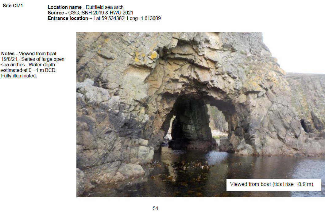 'Viewed from boat 19/8/21. Series of large open sea arches. Water depth estimated at 0 - 1 m BCD. Fully illuminated.' [Report 1145]