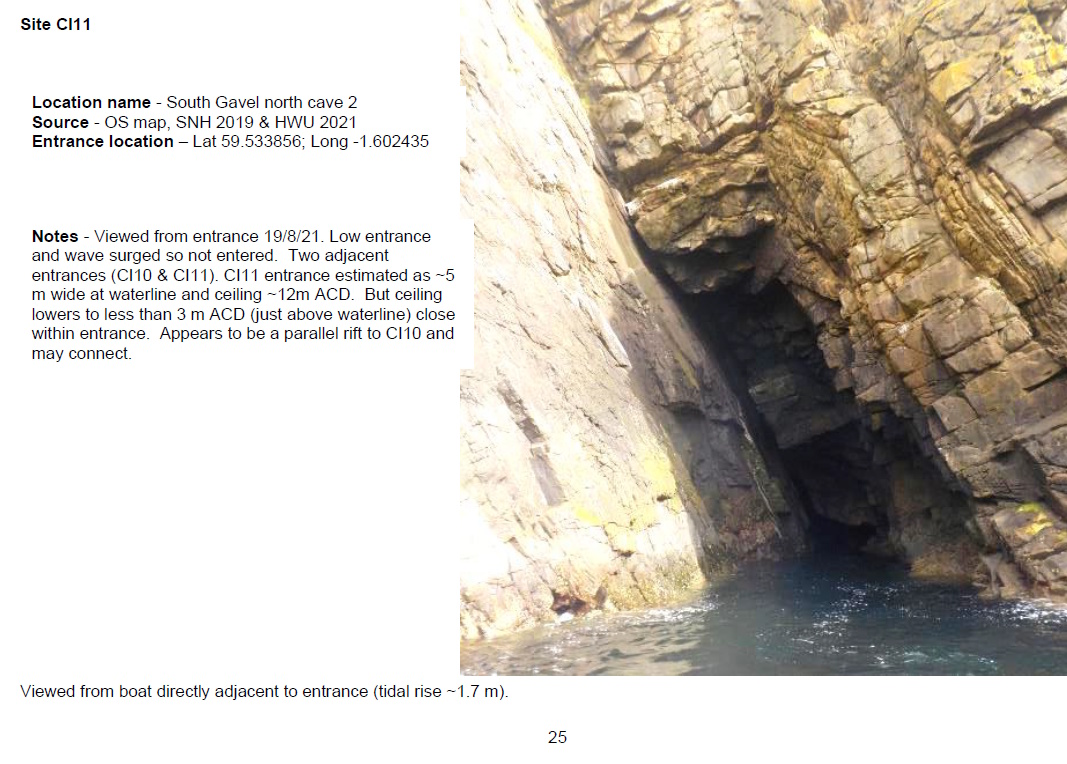 'Viewed from entrance 19/8/21. Low entrance and wave surged so not entered. Two adjacent entrances (CI10 & CI11). CI11 entrance estimated as ~5 m wide at waterline and ceiling ~12m ACD. But ceiling lowers to less than 3 m ACD (just above waterline) close within entrance. Appears to be a parallel rift to CI10 and may connect (inside). ' [Report 1145]