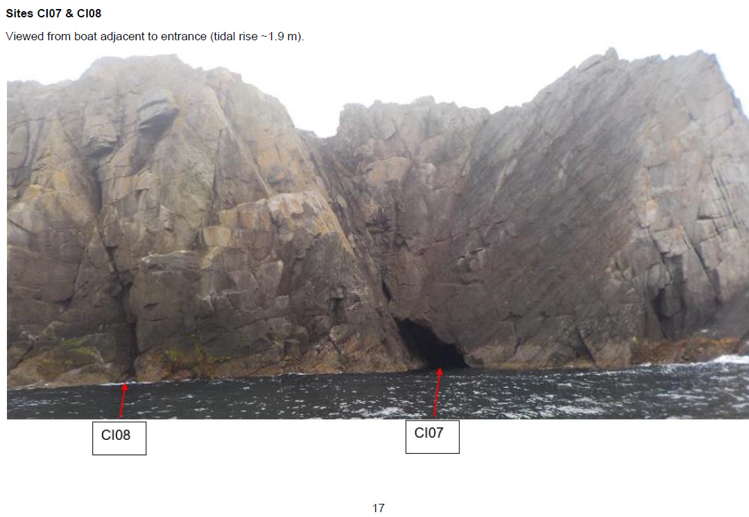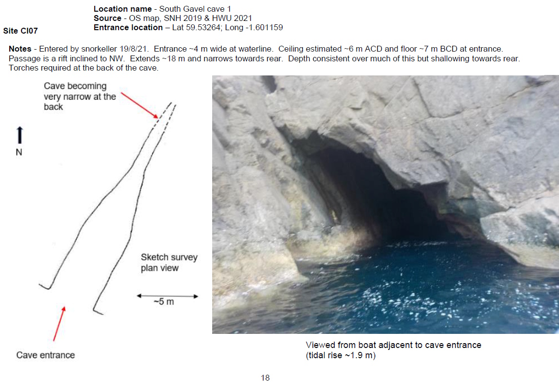 'Entered by snorkeller 19/8/21. Entrance ~4 m wide at waterline. Ceiling estimated ~6 m ACD and floor ~7 m BCD at entrance. Passage is a rift inclined to NW. Extends ~18 m and narrows towards rear. Depth consistent over much of this but shallowing towards rear. Torches required at the back of the cave. Alcyonium noted on cave walls near entrance.' [Report 1145]