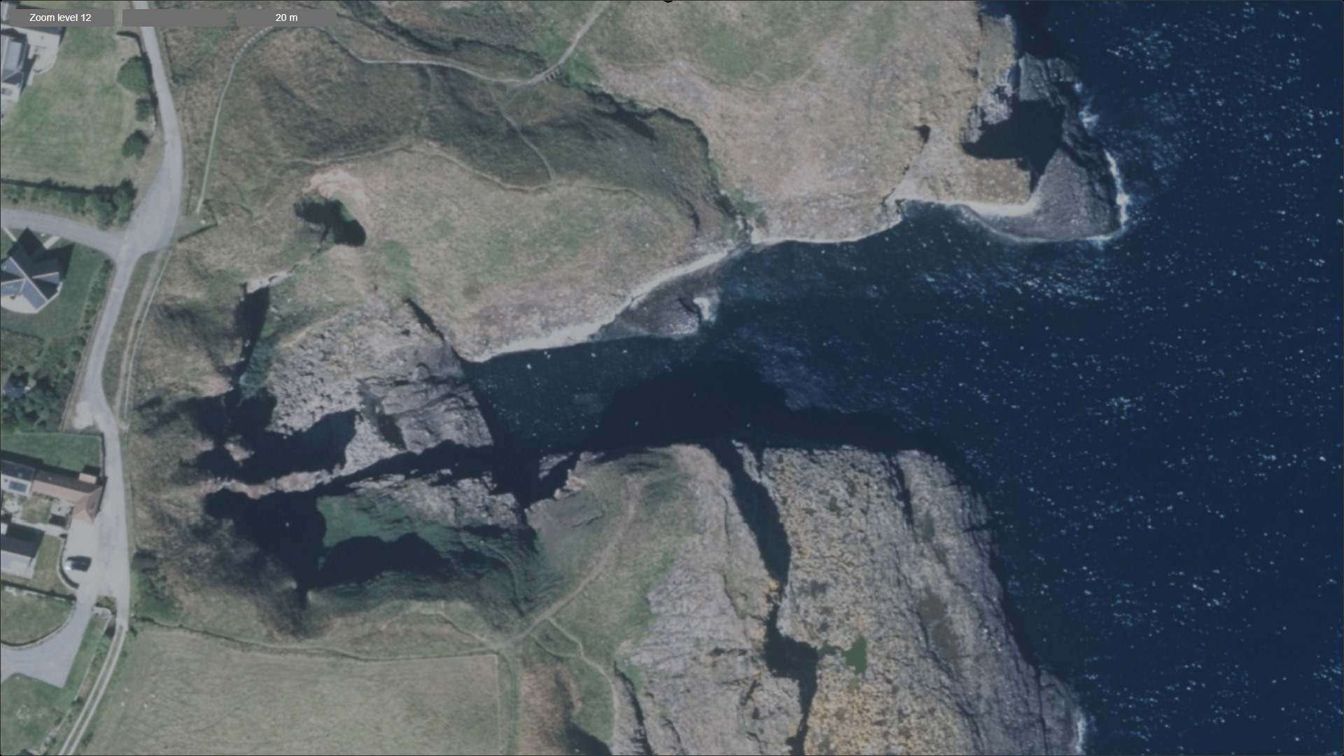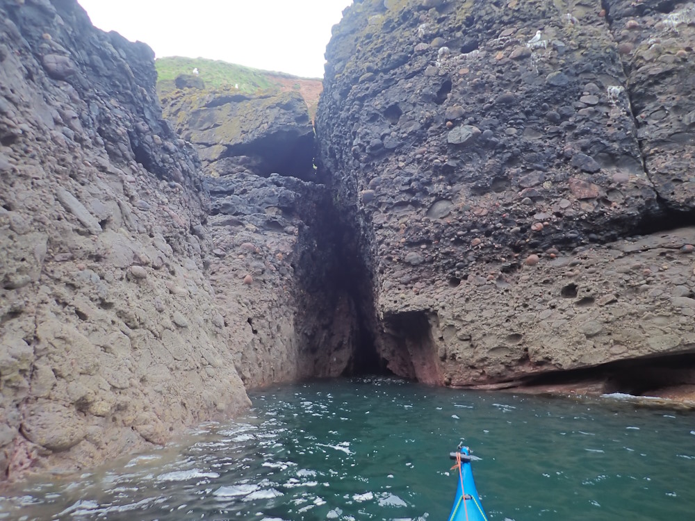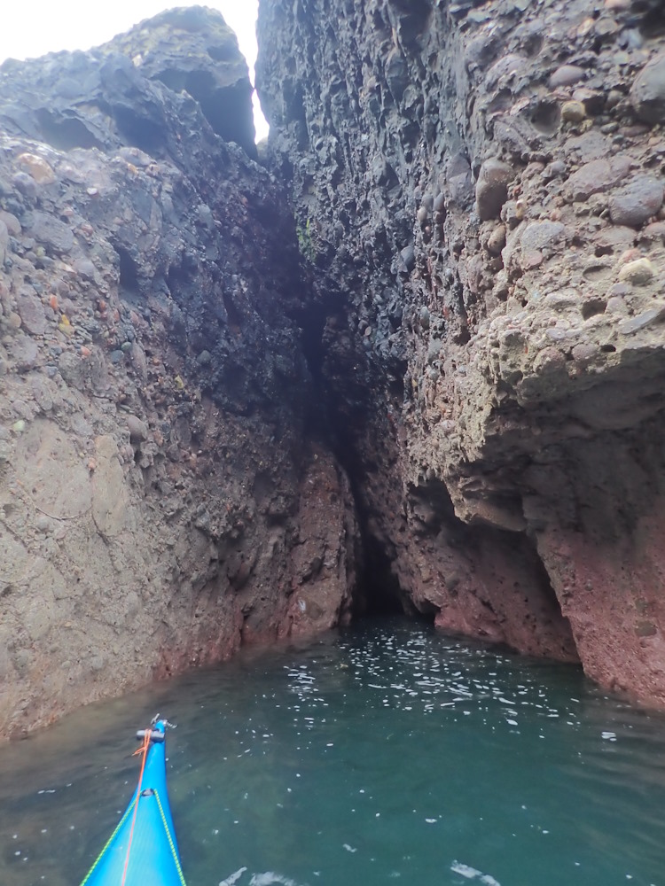 A vertical rift seacave which runs nearly NW (322) to what was a blowhole, but which is now blocked. The NGR is the sea entrance in the NW corner of Trollochy (a geo or fairly high sided inlet).