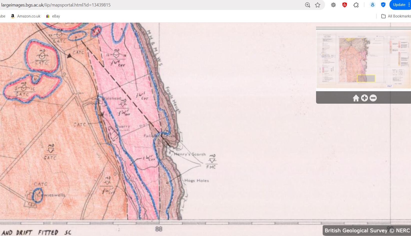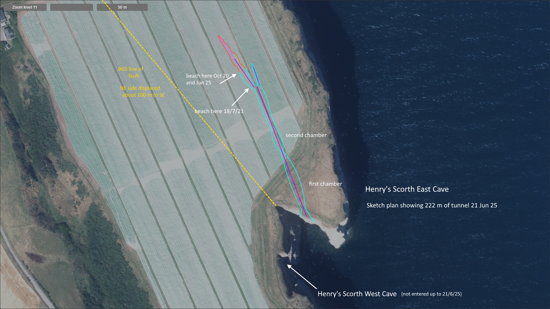 - Sketch plan drawn over an aerial view (Canmore) and based on the 5 partial length surveys noted above. The bend in the tunnel seems to roughly match a bend in the cliff edge to the right (E). The line of a fault from BGS 1:10 000 Solid and drift map has been added.