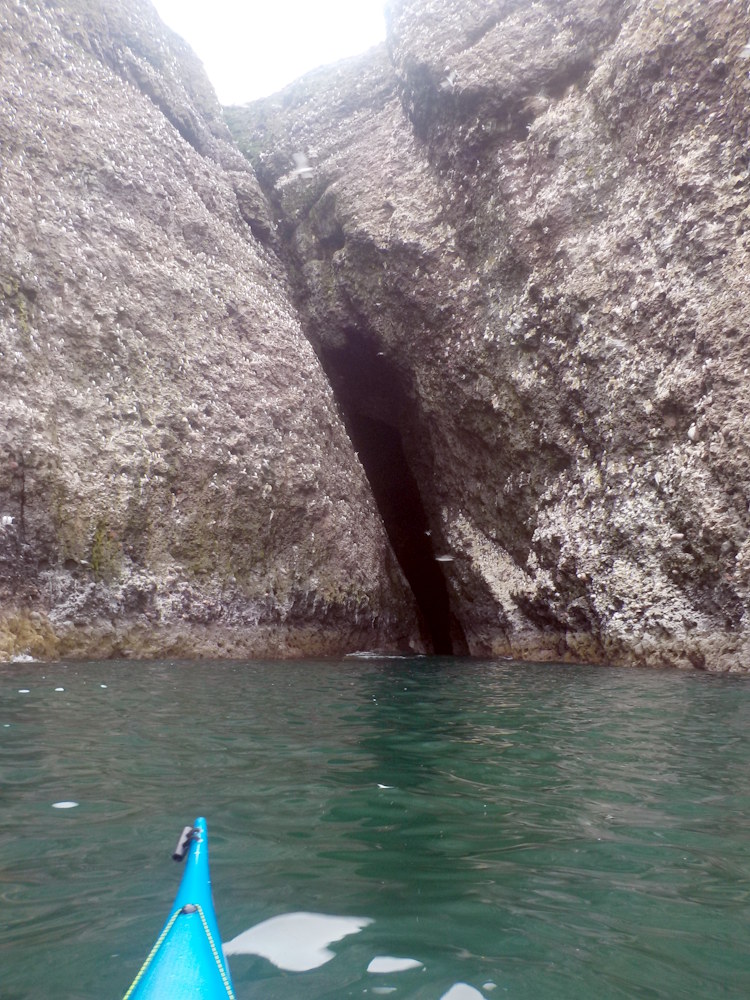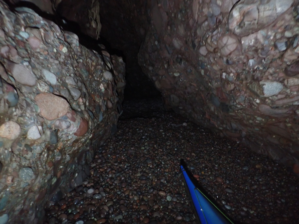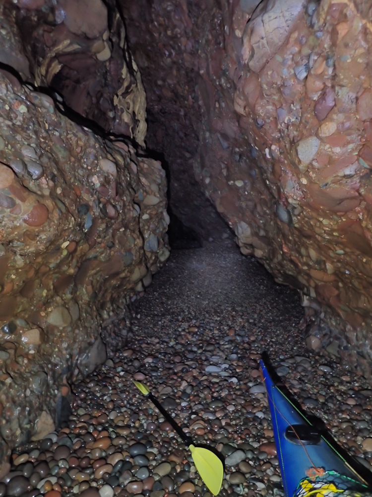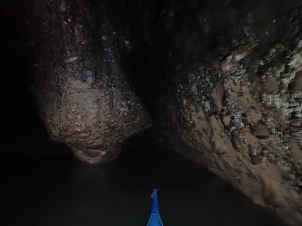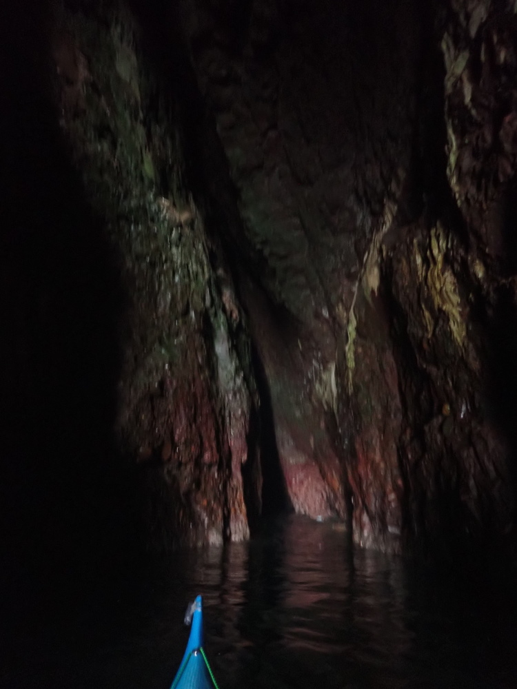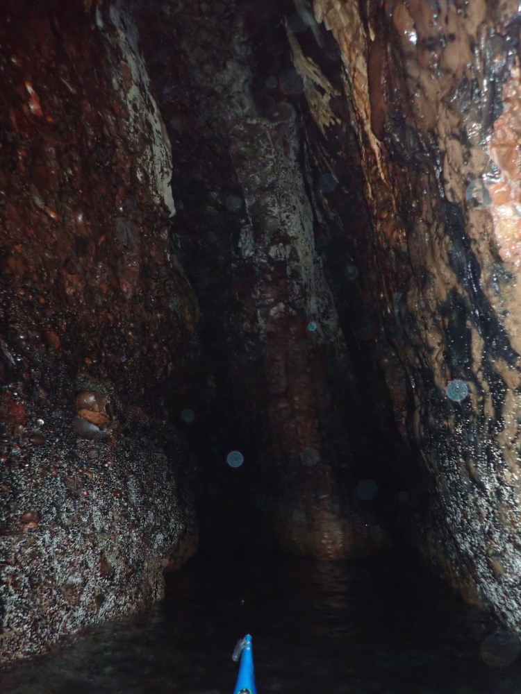 The first chamber is 7.4m wide and thus easily wide enough to turn a sea-kayak round in, but further in usually requires paddling backwards to come back out. However, on 18 July 21, a little after a 1.1 m low tide, it was just possible to turn a 5.5 m kayak just to S of the dividing pillar shown in photos 8, 14, 15, 16 and on the sketch plan.