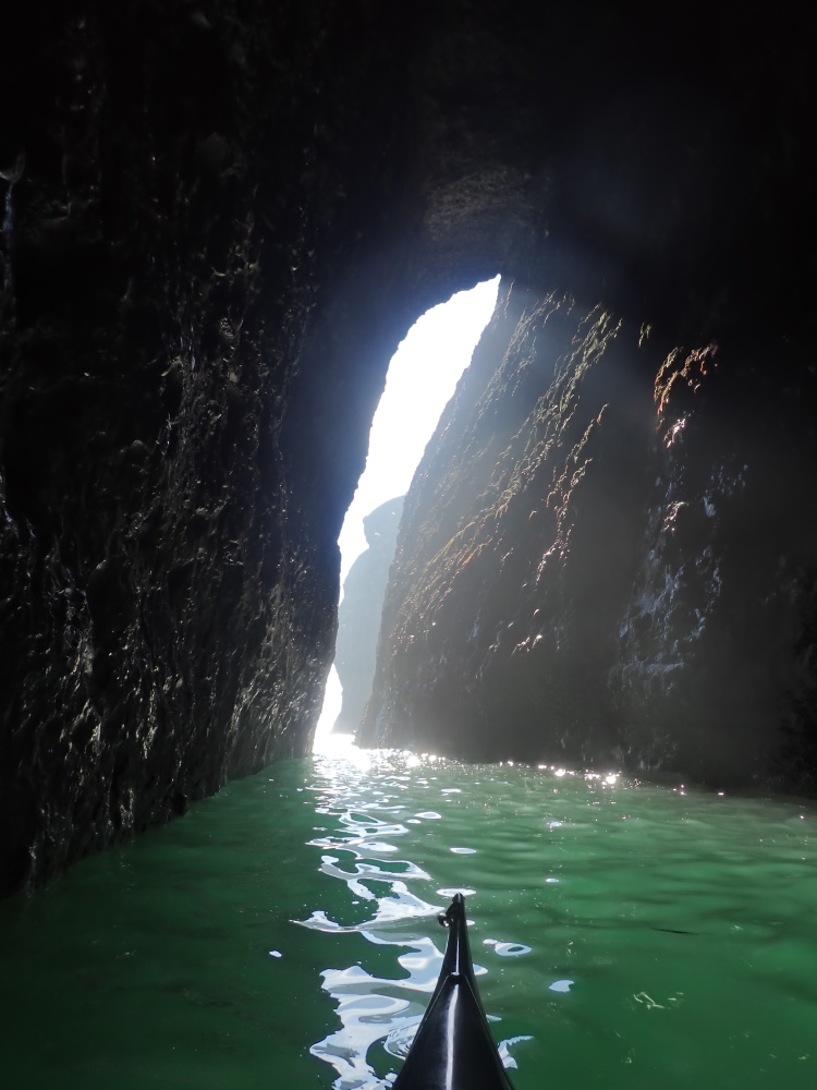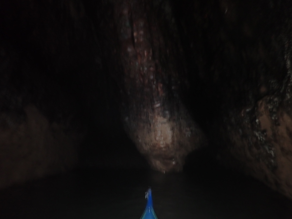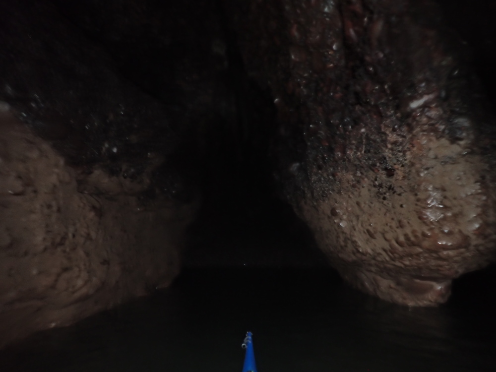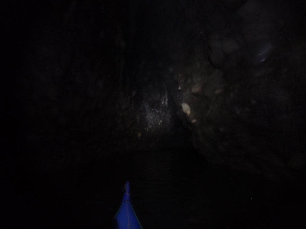 - Photo 17 taken from about 10 m into the left (W) branch beyond the dividing pillar. The tunnel has widened here and turned a little right. The beach line can just be made out where it meets the water a bit to the right of the kayak's bow. Seals were hauled out on the beach. Taken on 17Sep 24, when the visible top of the beach was 30 m beyond the dividing pillar.
