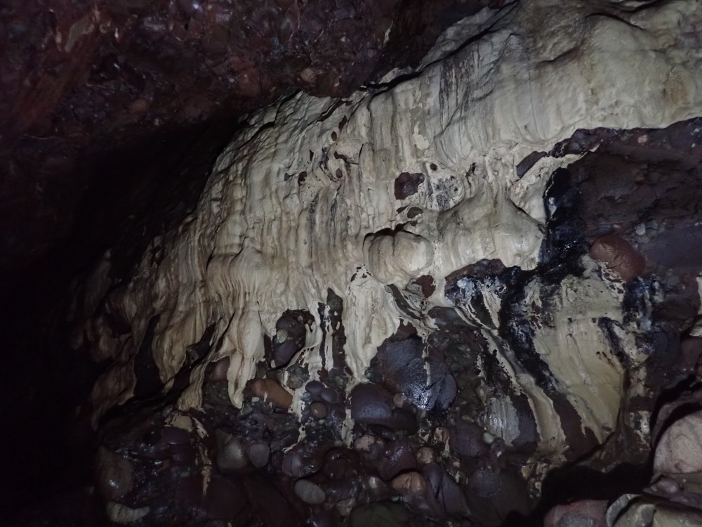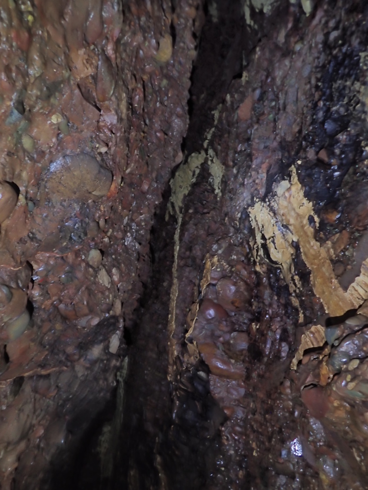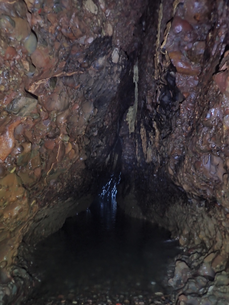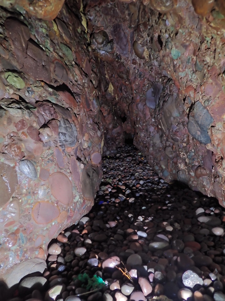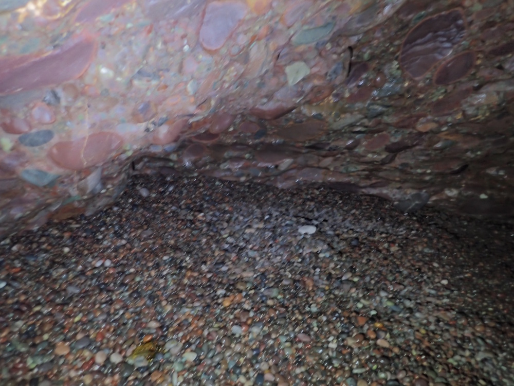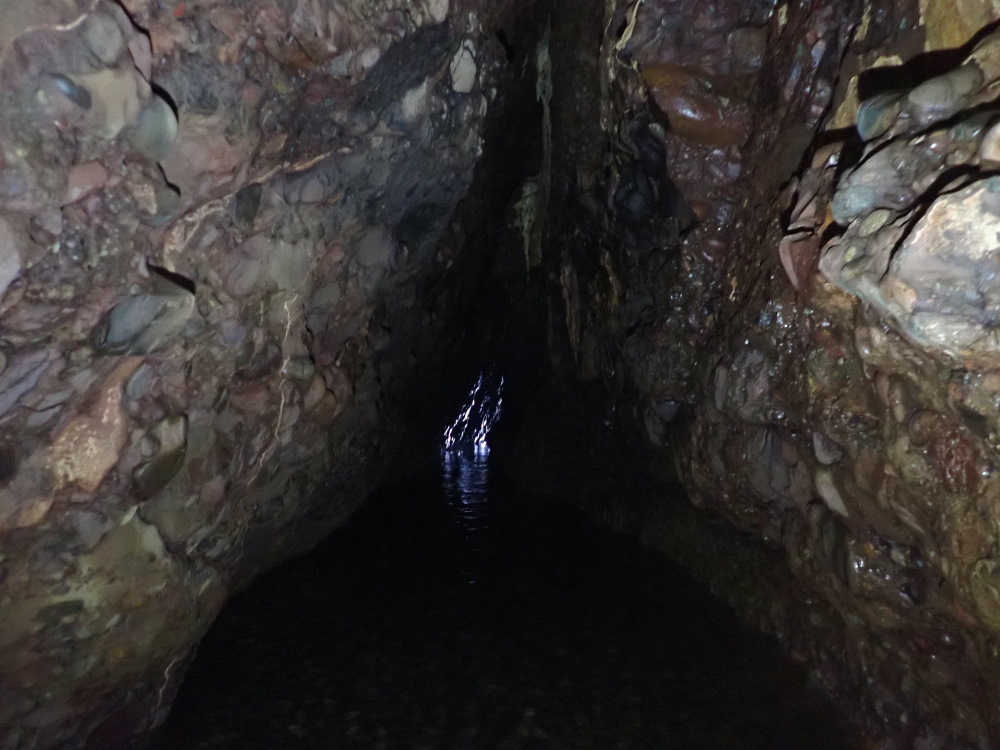 - Photo 10 taken from the water's edge at 3m tide level; looking back along the tunnel the reflection is from the wall on the E side, just beyond the pillar in 9. Note how smooth the conglomerate low down is, milled by the pebbles thrashed about by incoming waves/swell. There is some flowstone sheet higher up on the right.