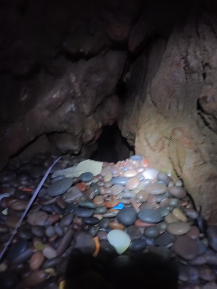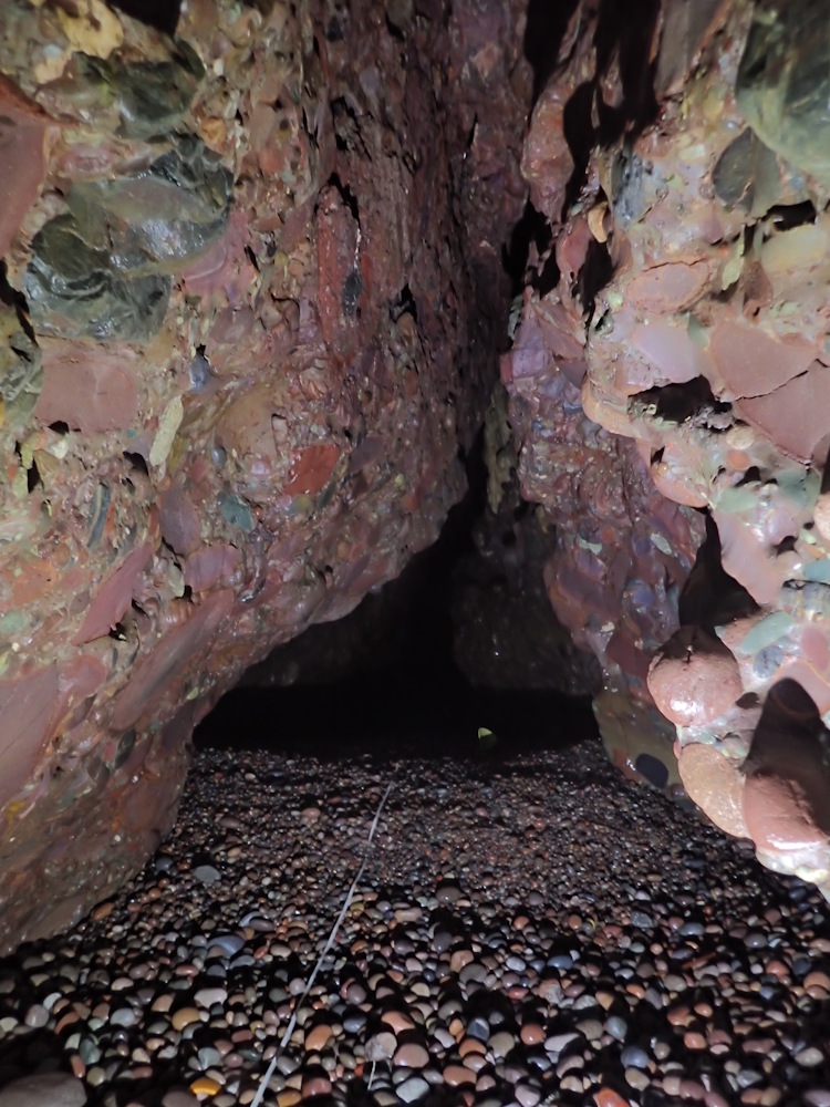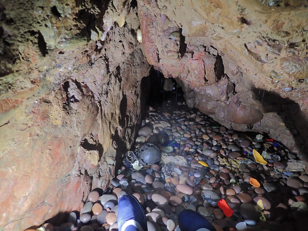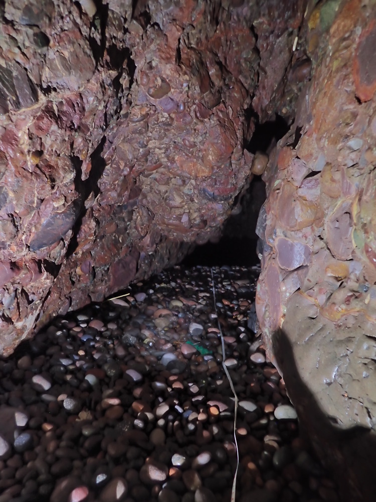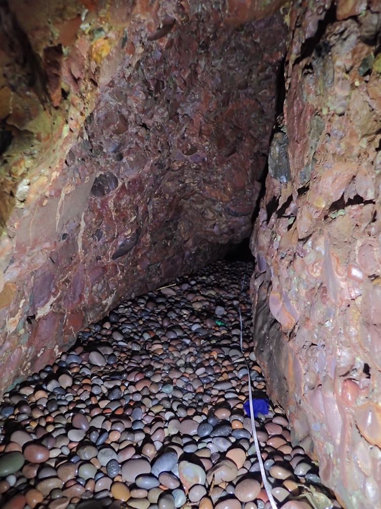 On 8 Oct 20 photos 9-13 were taken in the left (W) tunnel and its beached rift extension. But on 18 July 21, this tunnel was blocked by a shingle beach about 5-10 m along from the pillar. On the same day it was found that the S part of the N tunnel of Trough Cove had been blocked for a second year running (see entry for Trough Cove N entrance), having been unblocked between Nov 20 and Mar 21 and previously in 2019. This cave is much more difficult to enter as far as the pillar because there is nearly always too much swell.