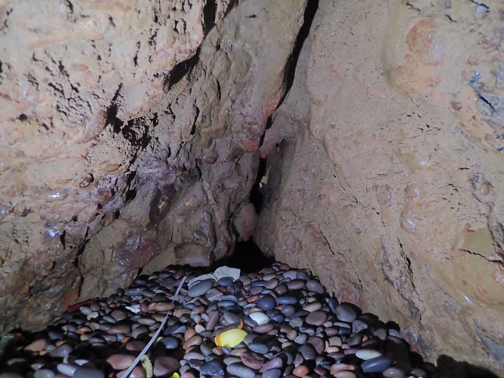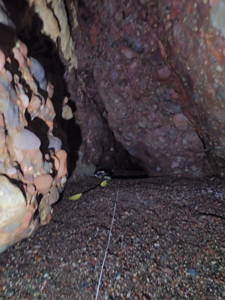 - Photo 30 at about 54 m in, looking back (SSE) at the fairly tight choke point. The pebble beach was about level after going down a little after the choke point.