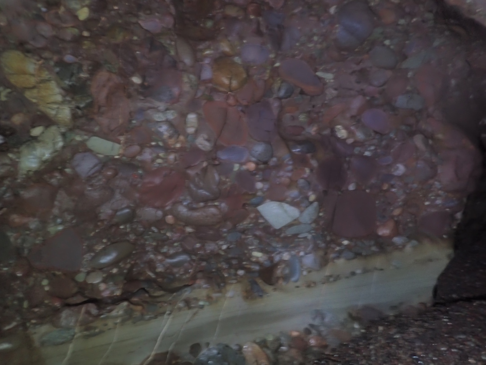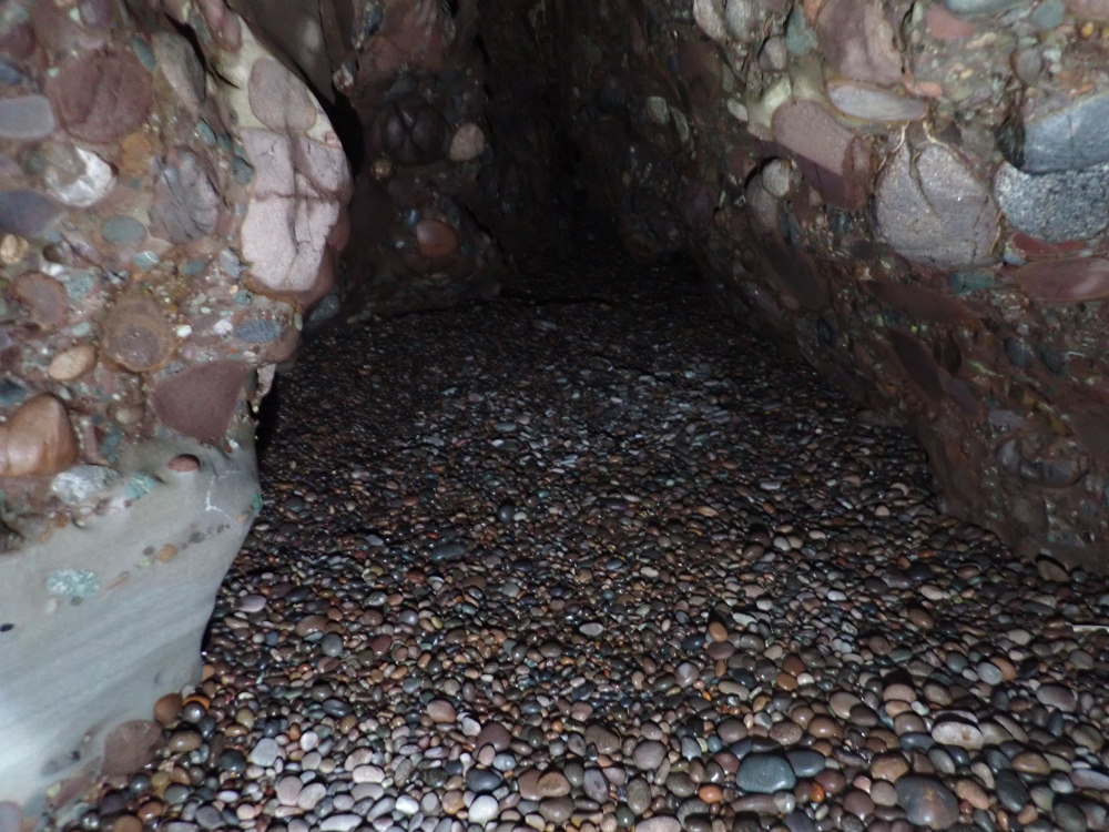 - Photo 11 shows the first wider part of the inner beach, beyond the narrows of photo 9 above. More milled conglomerate - in places the matrix is more resistant than some of the pebbles.