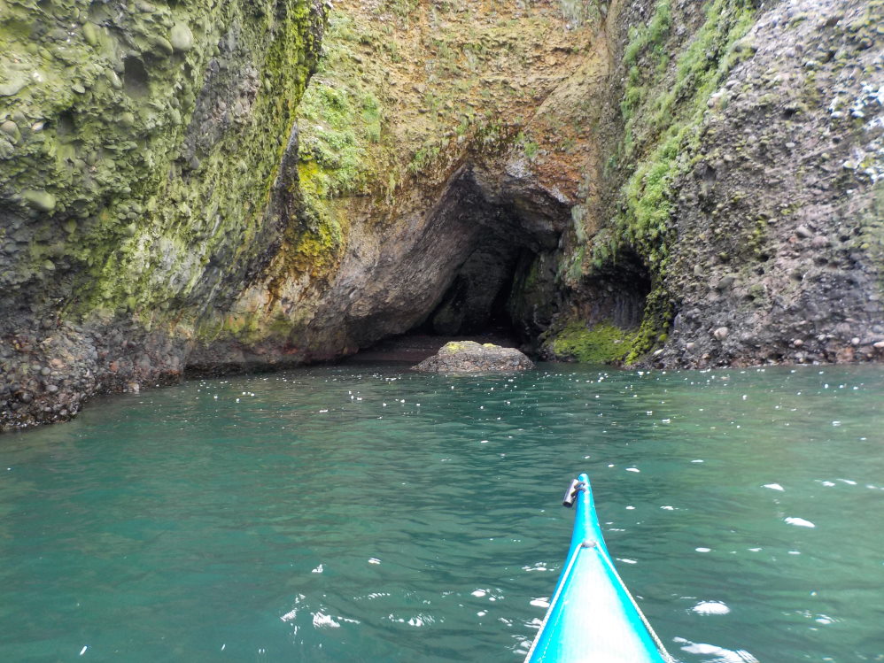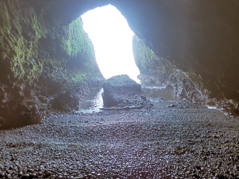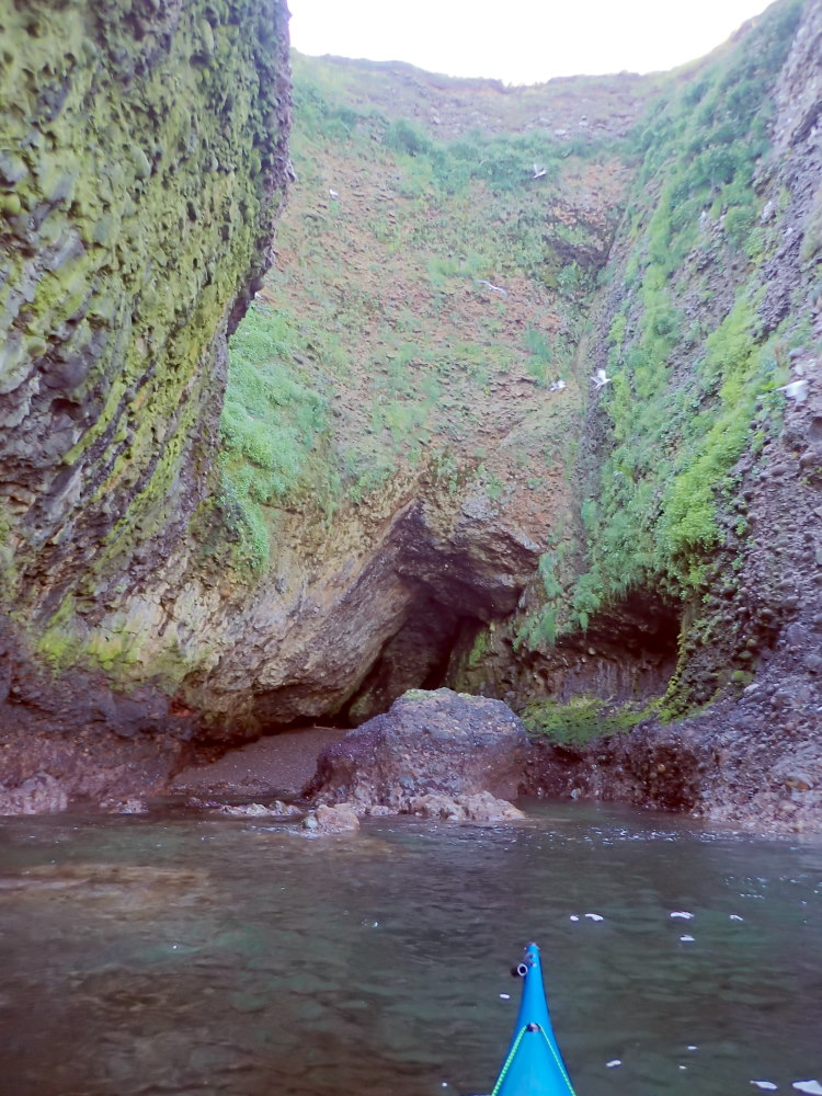 A partly intertidal double rift cave. There is a big lump of conglomerate under the entrance which looks as if it was once part of a dividing wall between two parallel tunnels, the W end of which extend 12.4 and 13.4 (N) beyond an inner dividing wall. There is extensive flowstone on the N wall of the N tunnel.