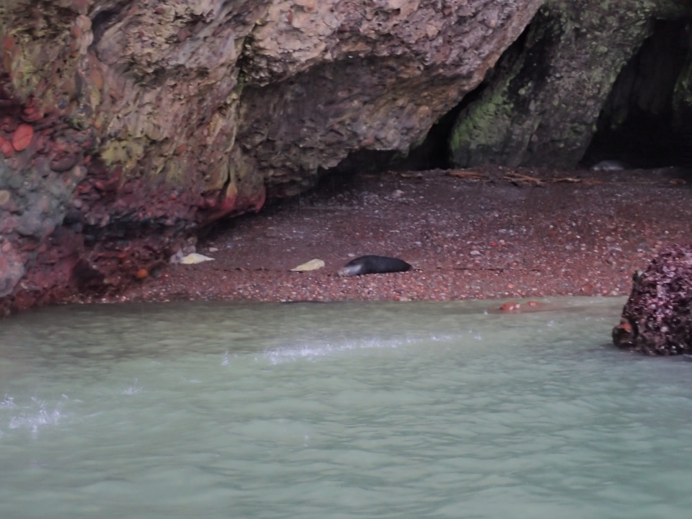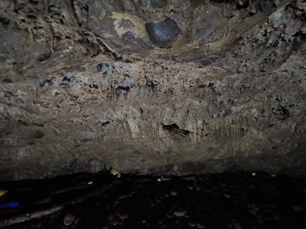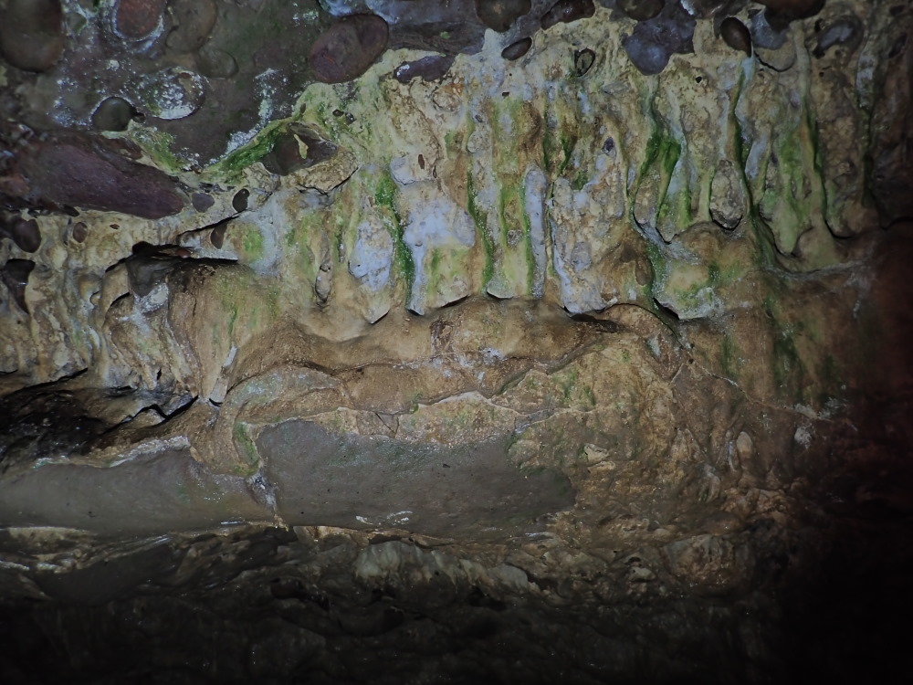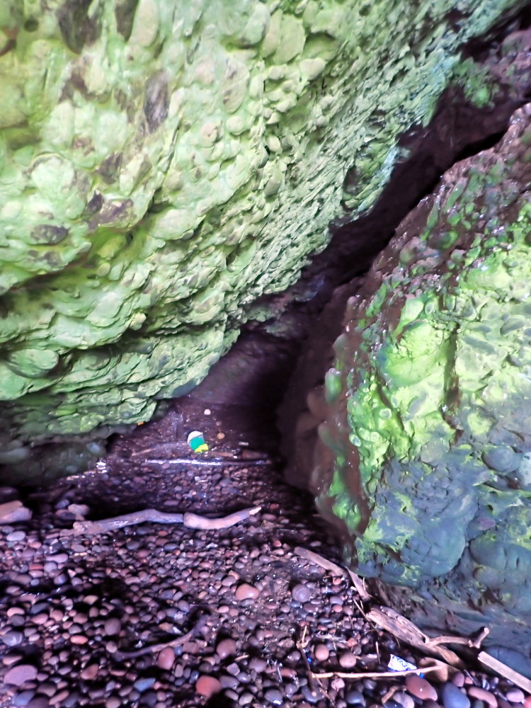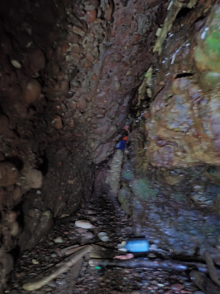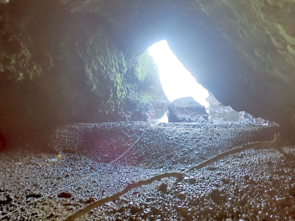 The dividing pillar is 33.3 m in at local beach level - it leans quite a bit seaward. Cave width is 14 m at this point and the extension tunnel axes are about 7m apart. The N tunnel is about 5m wide for 9.6 m, with its N wall at about 45 deg up to 2.5 m above the beach and further up it leans back to the N. The last 3.8 m is a narrow rift with the usual crop of buoys, drums and drink bottles jammed in the end crack. The flowstone is on the N wall only - see photos.