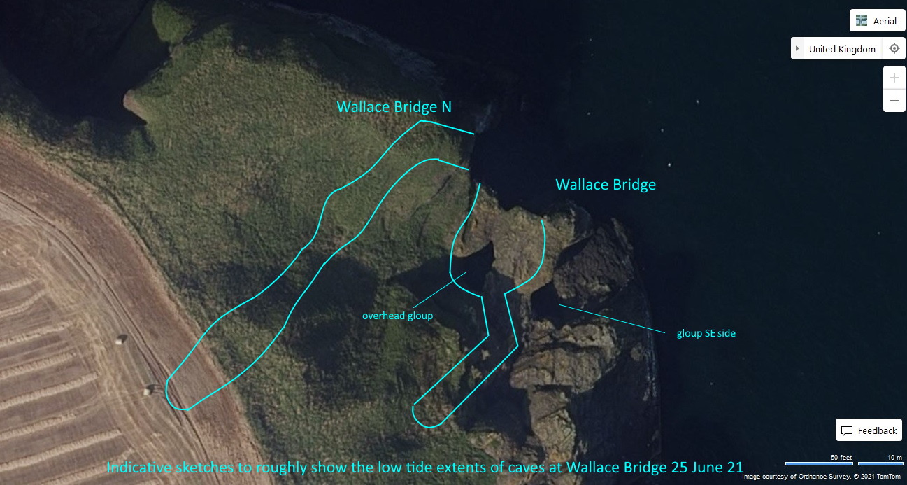Notes: Length is an estimate, partly visual, partly from aerial. VR from map contours and alt an estimate - by Nigel Feilden Jun 21. Cavern approx 20 m from entrance to back and 20 m wide (aerial). Inner tunnel estimated at 30 - 40 m.
