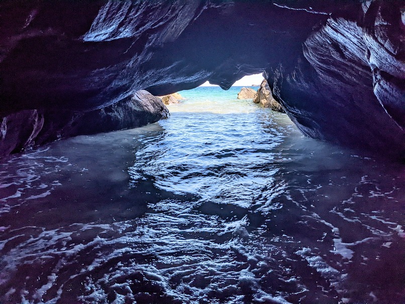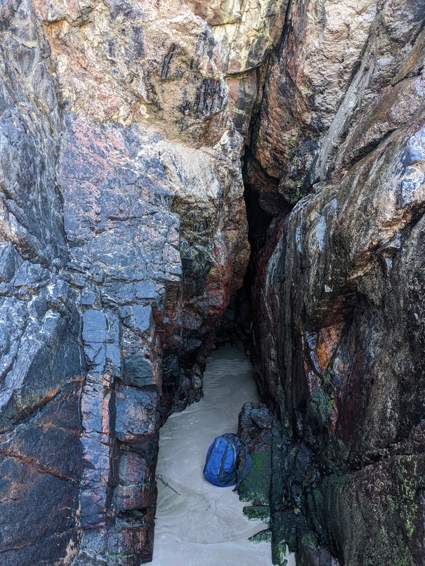 A tall [2-3 m], 1.3 m wide entrance leads into linear passage with largely similar dimensions, ending abruptly after 15m. In a similar manner to the neighbouring Sangobeg Cave [1], a narrow opening (0.6 m wide) located 11 m along the northern wall leads into a perpendicular 9 m long / ~5 m wide section. The entirety of the cave floods at high tide.
