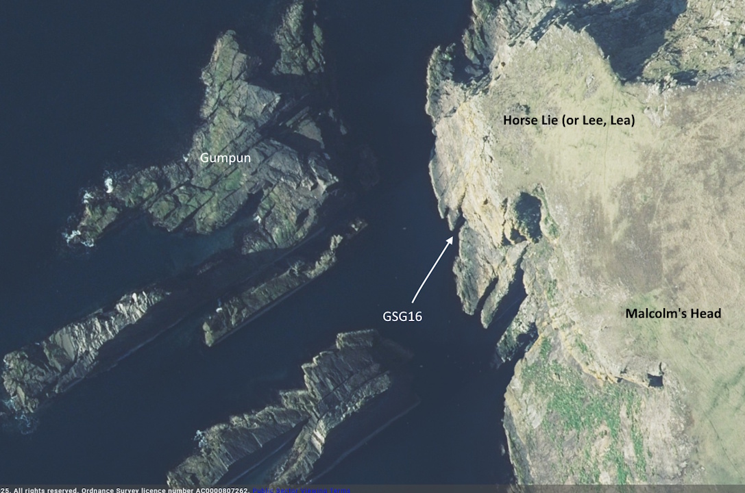Sea cave at the base of steep cliffs on west side of Malcolm's Head; at the level of the south end of Gumpun. From Pastmap Aerial, it faces SW, and probably follows the sandstone bedding.