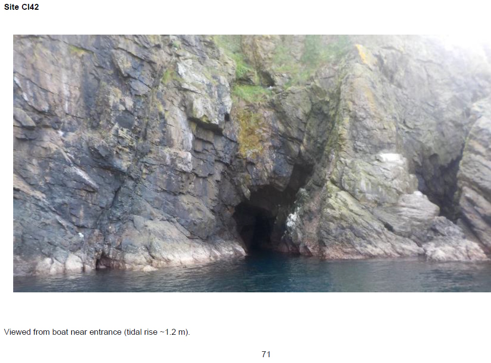 Sea cave at the base of steep cliffs in an inlet south-east of Funniquey, north-west of Hillia Tind.