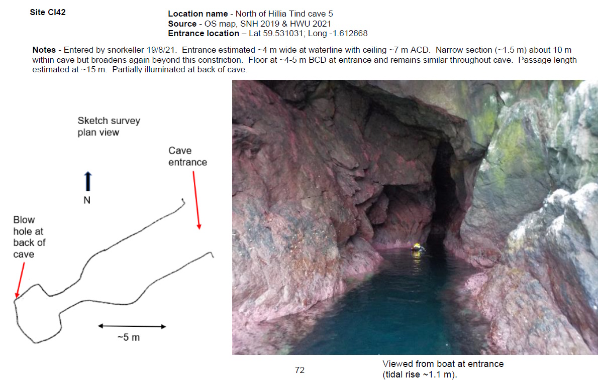 'Entered by snorkeller 19/8/21. Entrance estimated ~4 m wide at waterline with ceiling ~7 m ACD. Narrow section (~1.5 m) about 10 m within cave but broadens again beyond this constriction. Floor at ~4-5 m BCD at entrance and remains similar throughout cave. Passage length estimated at ~15 m. Partially illuminated at back of cave. Cave walls with tube turf & spirorbins. Sparse Grantia & Halichondria present. Blowhole at back of cave.' [Report 1145]
