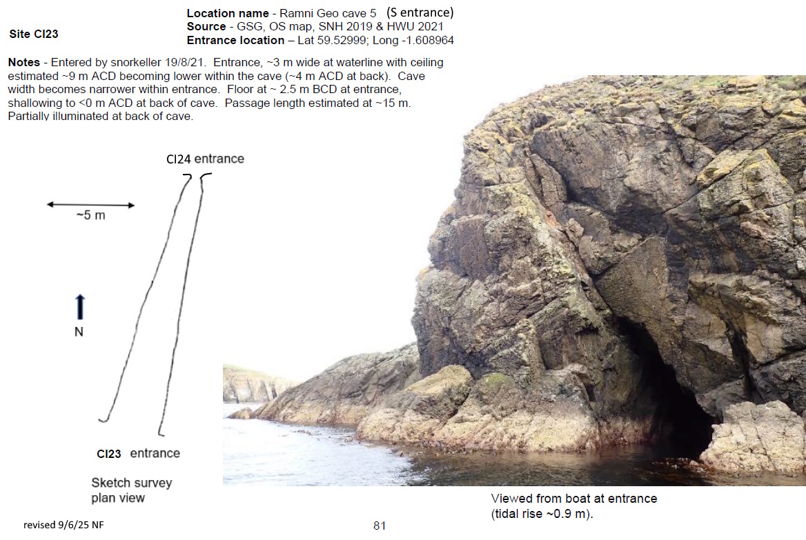 South entrance CI23: 'Entered by snorkeller 19/8/21. Entrance, ~3 m wide at waterline with ceiling estimated ~9 m ACD becoming lower within the cave (~4 m ACD at back). Cave width becomes narrower within entrance. Floor at ~ 2.5 m BCD at entrance, shallowing to <0 m ACD at back of cave. Passage length estimated at ~15 m. Partially illuminated at back of cave. Noted Verrucaria and Hildenbrandia on walls & ceiling. Boulder floor with coralline crusts and patches of Halichondria and barnacles. Actinia & Patella near entrance.' [Report 1145]