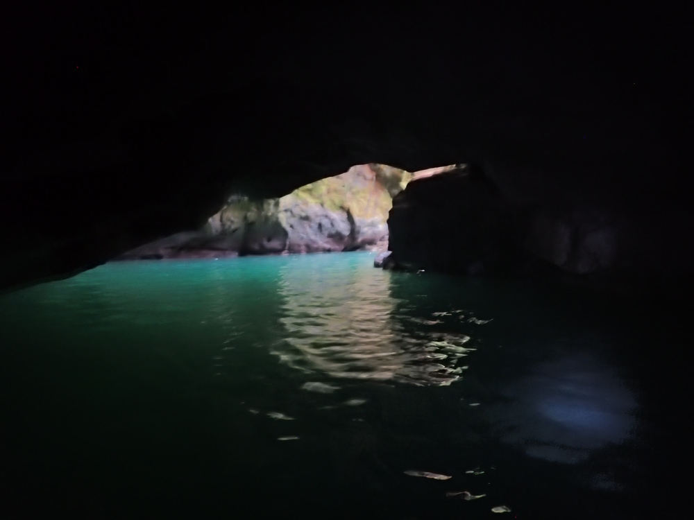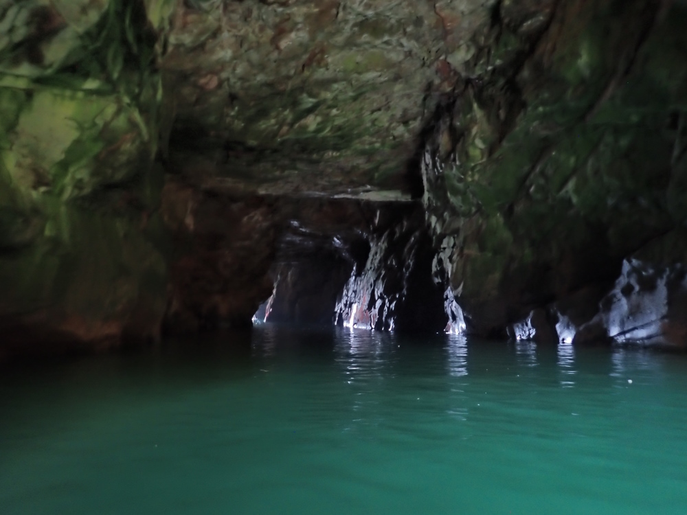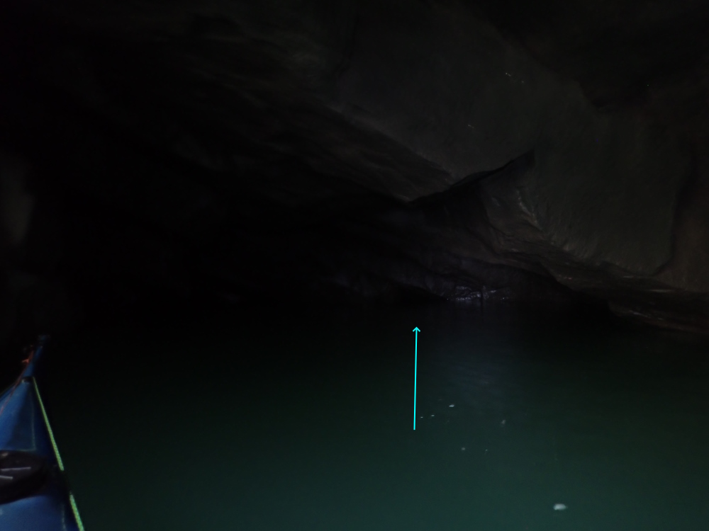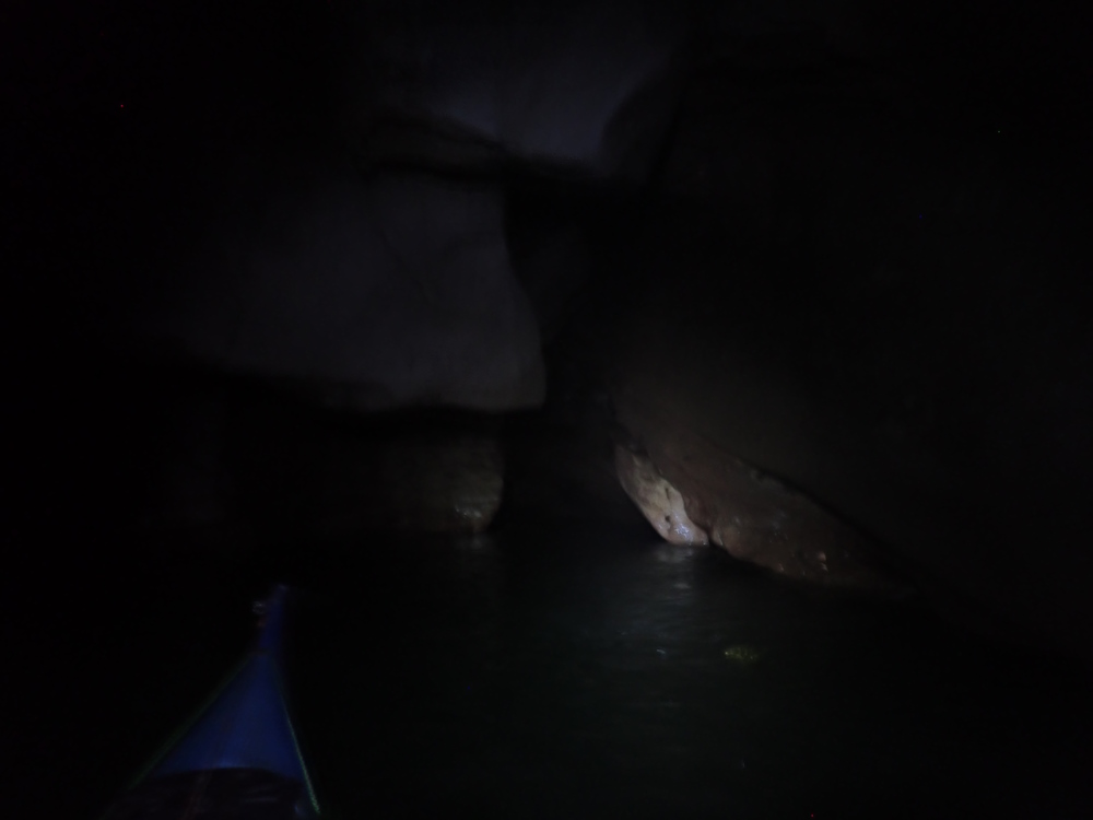 A mostly subtidal cave tunnel running from this sea entrance to the much smaller N entrance which opens into the base of the S end of Gaylet Pot. It is straight enough to be able to see the other end. Going N from this S entrance, the tunnel remains wide and high for 30 m or so where a large rectangular block sticks out about 8 m from the W side and continues another 25-30 m before going back to the original line. On the E side, the tunnel widens somewhat at sea level, and much more higher up. The E wall here is not at all smooth, with some quite large V plan alcoves in it. It comes back roughly to its original line about half way along. The ceiling is also lower, but continues to be rather horizontal. The N entrance is shorter and narrower than the S entrance; is intertidal and triangular. Just S of the N entrance, on the E side, there is a low extension with a rectangular plan about 10 m E and 12 m parallel to the tunnel axis. It has two small tunnels in the SE and NE corners. The SE one (photo 8) appears to run roughly E and - at a tide level of 4.5 m ACD was nearly swamped and nothing could be seen of its length. The NE one runs N (photo 9), probably at least 4 m, and sounded as if it has a pebble beach. There may be a low tide tunnel in the W wall, about 2/3 of the way from S to N. Noises were heard coming out of a narrow crack which suggested a hidden volume.