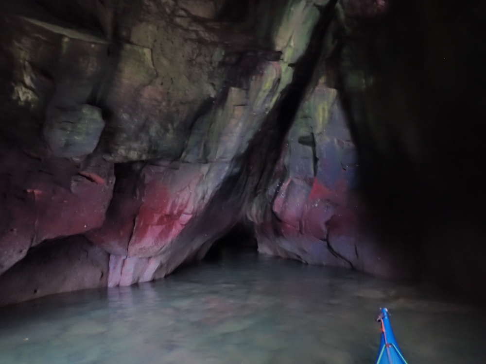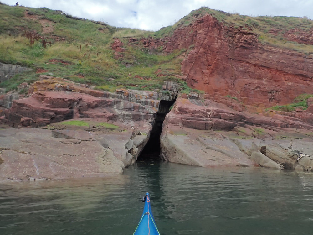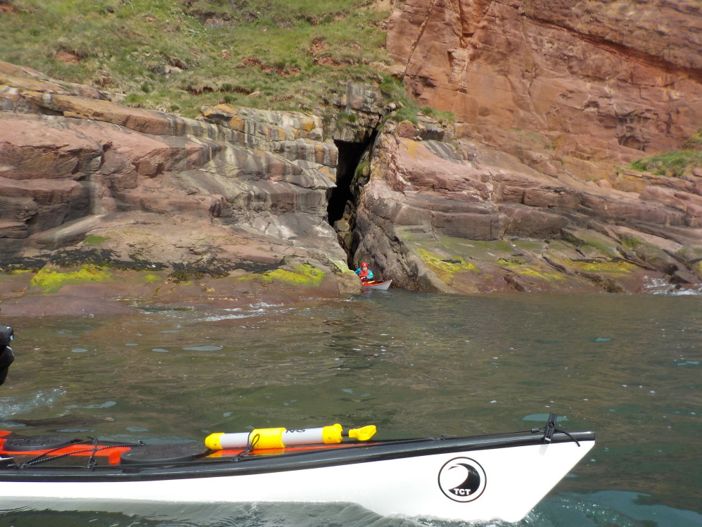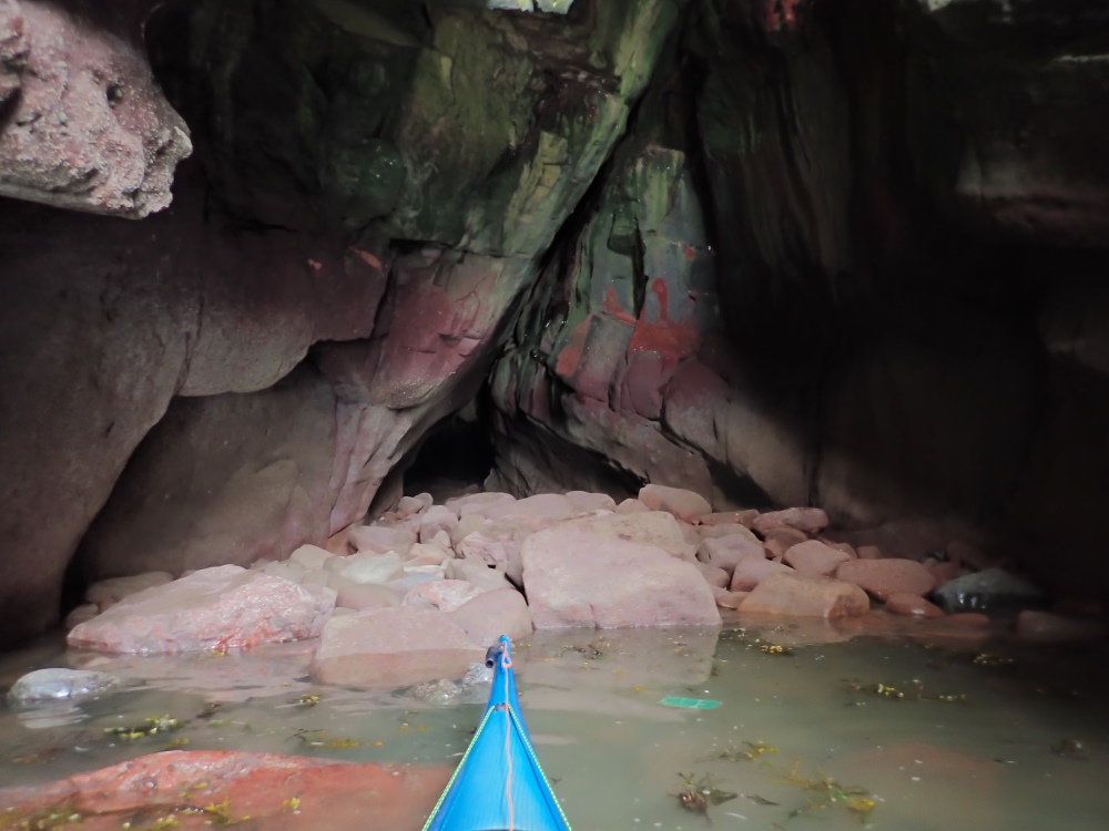 ii) A permanently-flooded eastern entrance at NO 66313 41262 (see registry entry #5140). This is located at the head of the obvious cliff-sided inlet known as Monk & Maiden's Leap, accessible only by boat [although on 30 June 25, using full wetsuits & buoyancy aids for swimming in calm sea conditions, a GSG party achieved a straightforward through-trip of this cave en-route to additional through-trips of Yellow Rock Cave & Mermaid's Kirk Cave]. At high tide (above 4.1 m ACD and perhaps up to about 5.0 m) it is possible to kayak from one entrance to the other. 4.4 m was fine on 23 June 18.