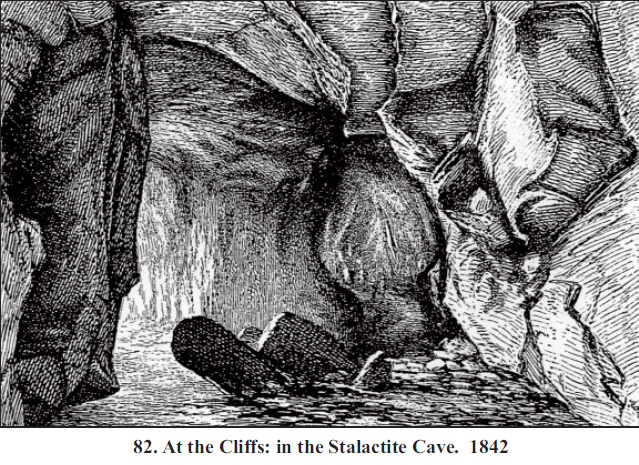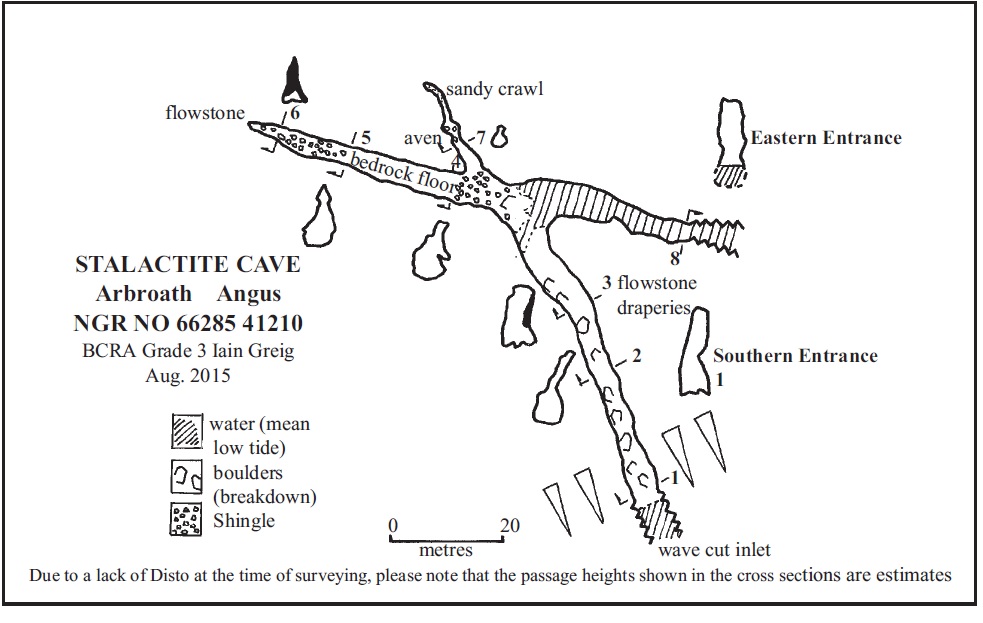 Excerpt from G. Hay, 1867: "A short distance east from this cavern [Barricaded Cave, registry site #1663] is the one that has been called the Stalactite Cave. It has two entrances, separated from each other by many hundred feet. The western entrance is a narrow gorge, opening out on the sea shore. This gorge had got filled up with fallen rocks, and it appears that the existence of the cavern had been long unknown prior to September 1842, when the gorge was opened and the cavern explored. The cave consists of two chambers, one larger than the other, but both of very considerable dimensions. The eastern entrance, which is through a tunnel at the base of a tall perpendicular cliff, can only be approached by boat. The sea flows in at both entrances, the waves meeting at full tide in the middle of the cavern, producing a reverberating noise which, especially in storms, is truly terrific. The roof and sides of the cavern were studded with stalactites, but many of these beautiful formations have been broken off and taken away."