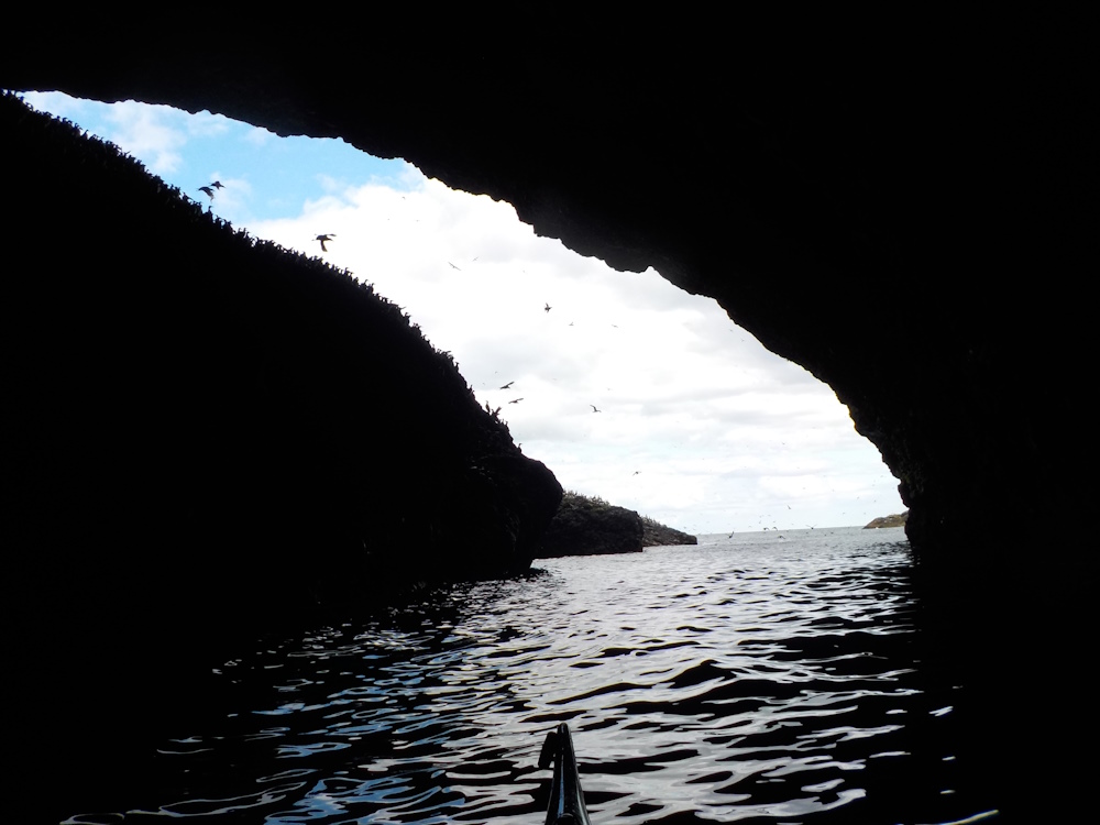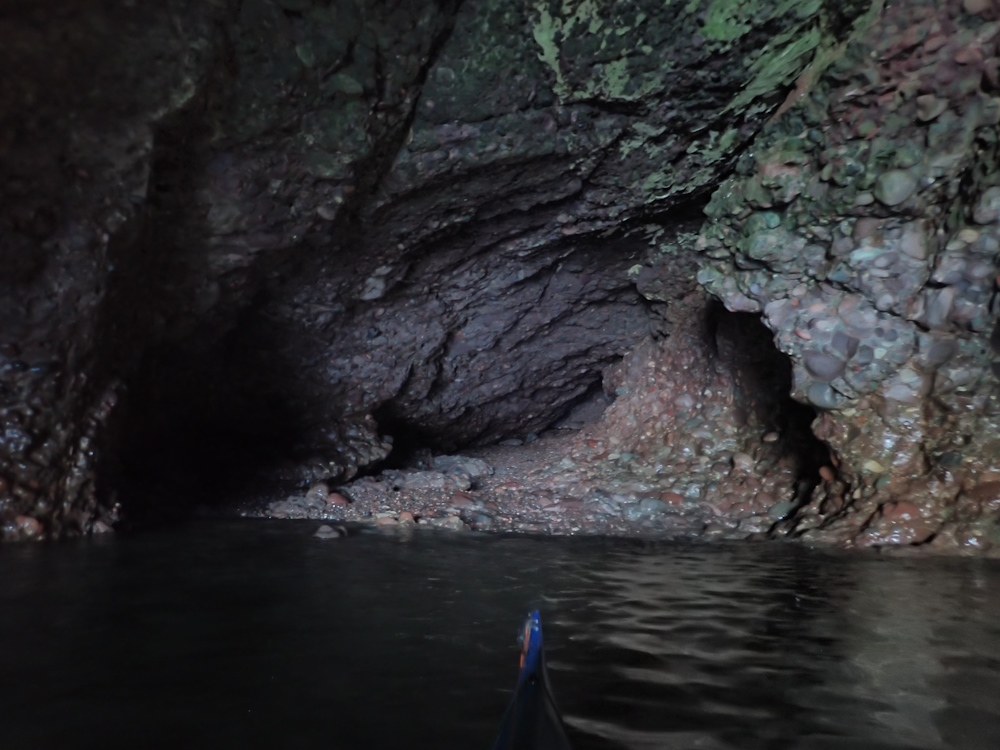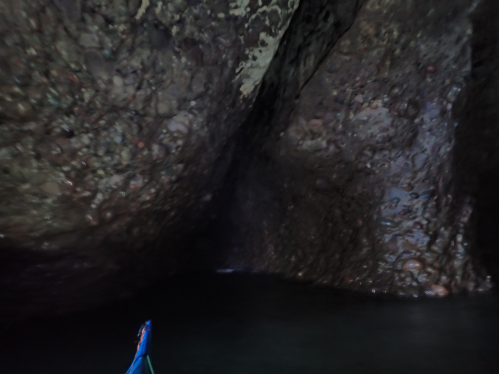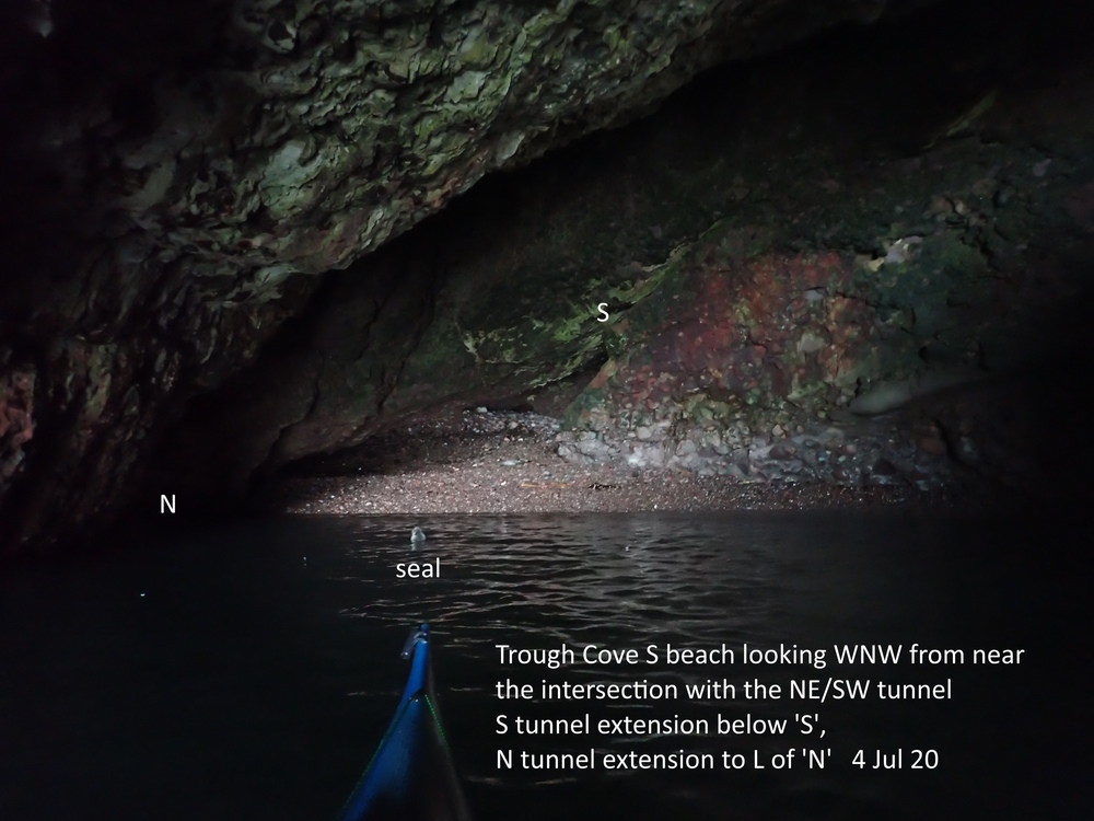 - Photo 5 from inside the S tunnel shows the S beach; taken 4 Jul 20, near HW. The N tunnel is round to the right. The entry to the extension of the S tunnel can be made out at the back of the beach. The extension to the N tunnel is in shadow on the left. There is a seal looking at the kayak near the beach.