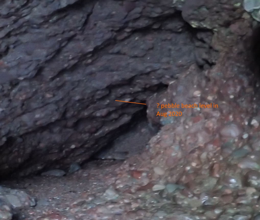 - Photo 6 shows the entrance to the extension of the S tunnel taken from the beach on 15 Aug 20. The level of pebbles on this beach is particularly high.