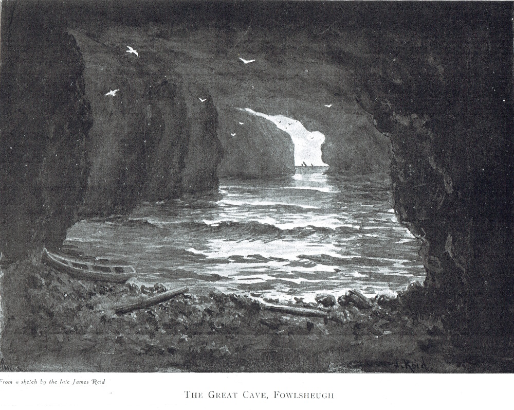 - 1. Deeside Field. 1927, vol 3, pp 82-85, James Reid, 'The Caves and Birds of Fowlsheugh'. "Not far from the North end of Fowlsheugh is the Great Cave or Throch Cove, which can be visited at all states of the tide. The entrance, an archway 150 feet wide and 50 or 60 high, is supported by an enormous buttress. Sailing in, we find ourselves in a mighty cavern, resounding like a seashell to the wash of the waves and the weird unearthly cries, as if of lost souls, of the guillemots and puffins that nest inside along with the blue rock pigeon which slips swiftly but noiselessly out as we enter. This cave is about 100 yards in length and in size and architecture is possibly matchless on the east coast of Scotland. The roof is formed in the shape of a dome and 60 feet below it is the restless sea, ever vocal, ever reflecting light and shade. To this watery floor much of the fascination of this scene is due. A special feature of Throch Cove is a huge upright side fissure illuminated from outside with fine effect. This winding passage may be threaded by a small boat at high water and leads to the open sea."