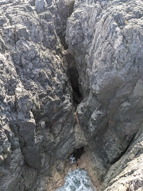 Tight slot with water breaking into the entrance even at low tide.